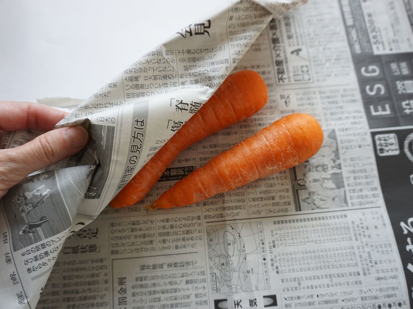 にんじんは水気に弱いので、乾いた新聞紙に包んで、冷蔵庫(野菜室)で茎を上に立てて保存します。