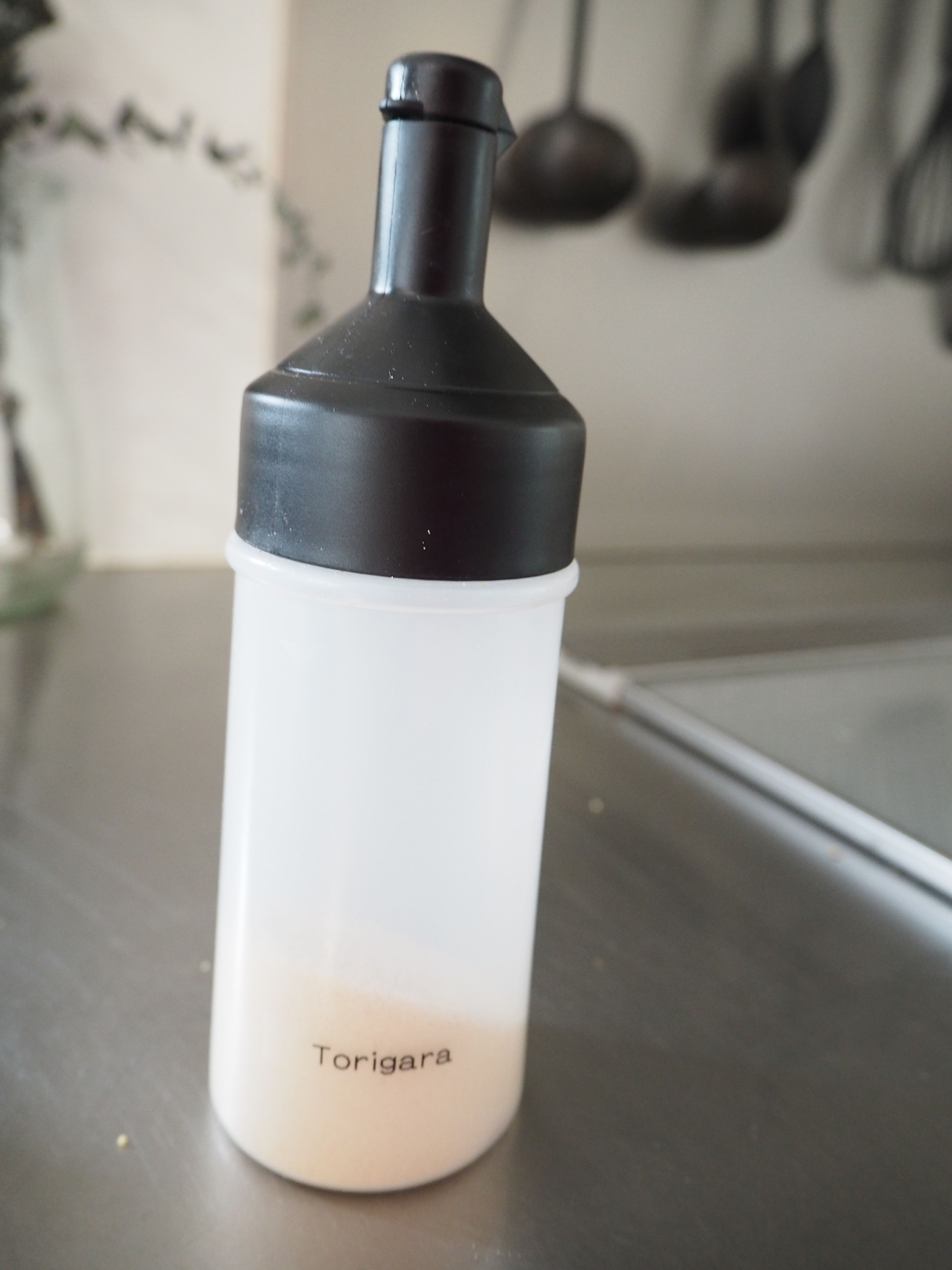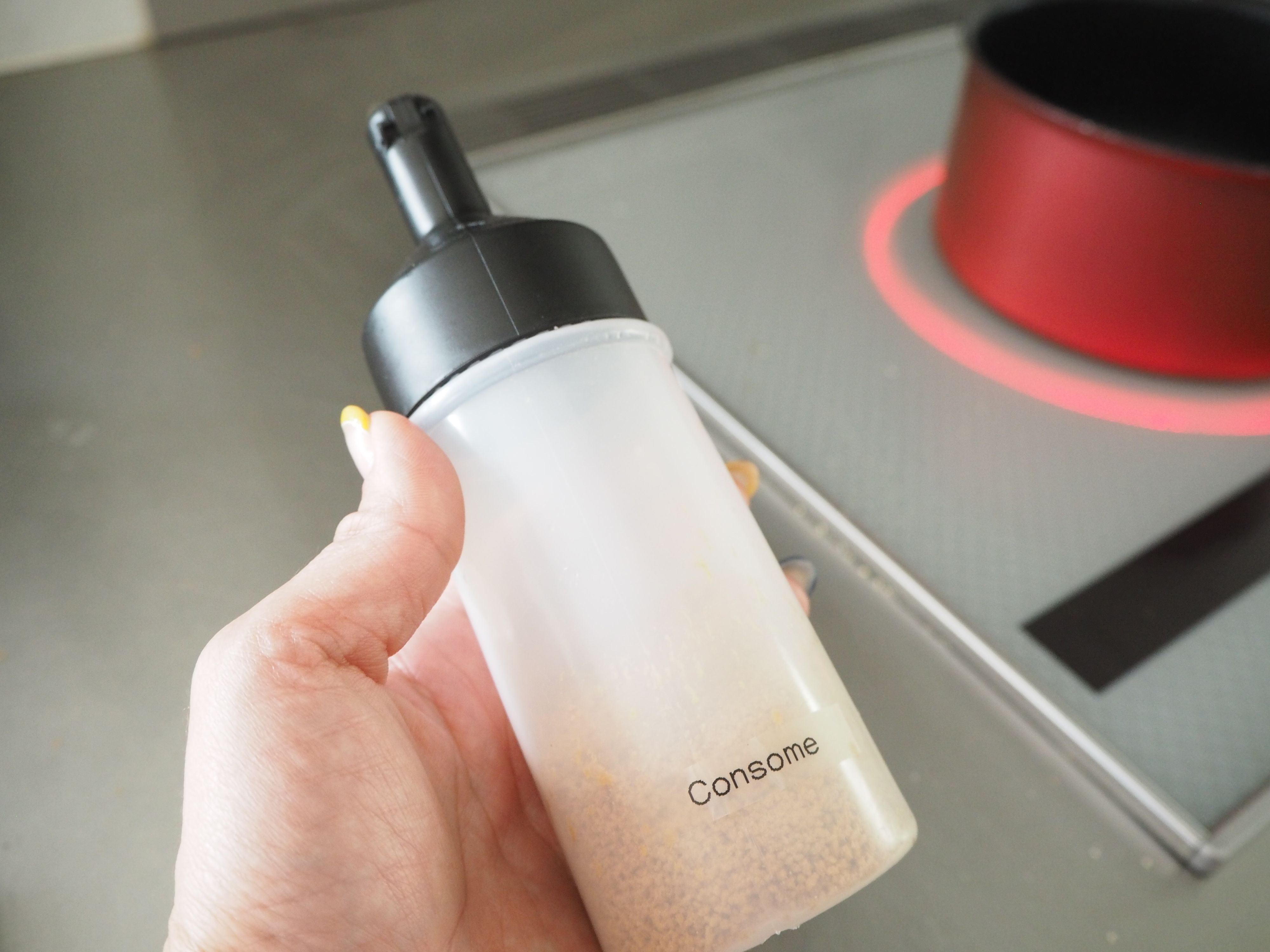 セリアの定番アイテム“オイルポット”。片手で開け閉めしやすいキャップが特徴。オイルポットですが、コンソメの顆粒だしや鶏がらスープのもとなどの顆粒の調味料を入れることも可能。ふたを開けてサッと一振り!楽ちんです。