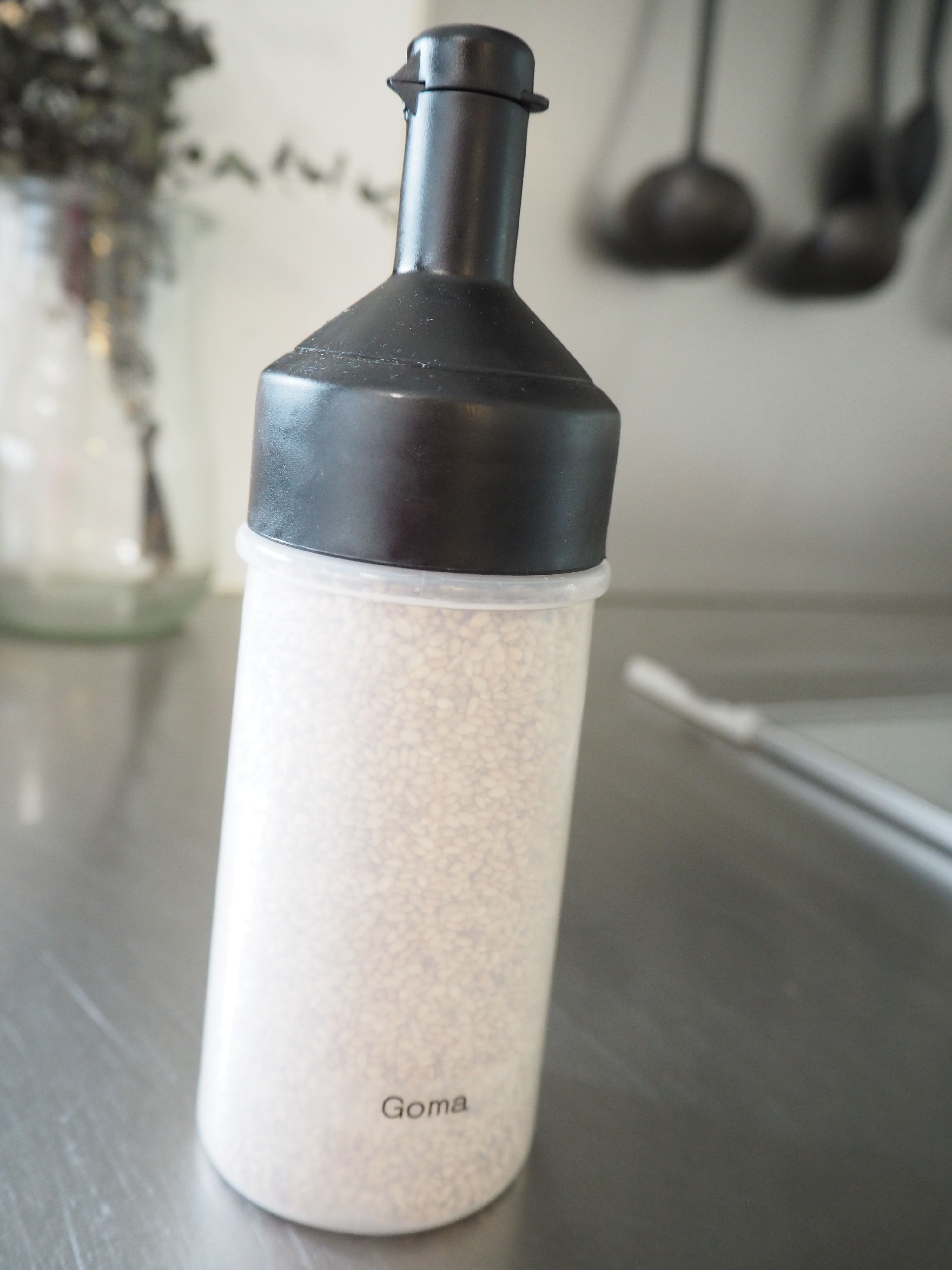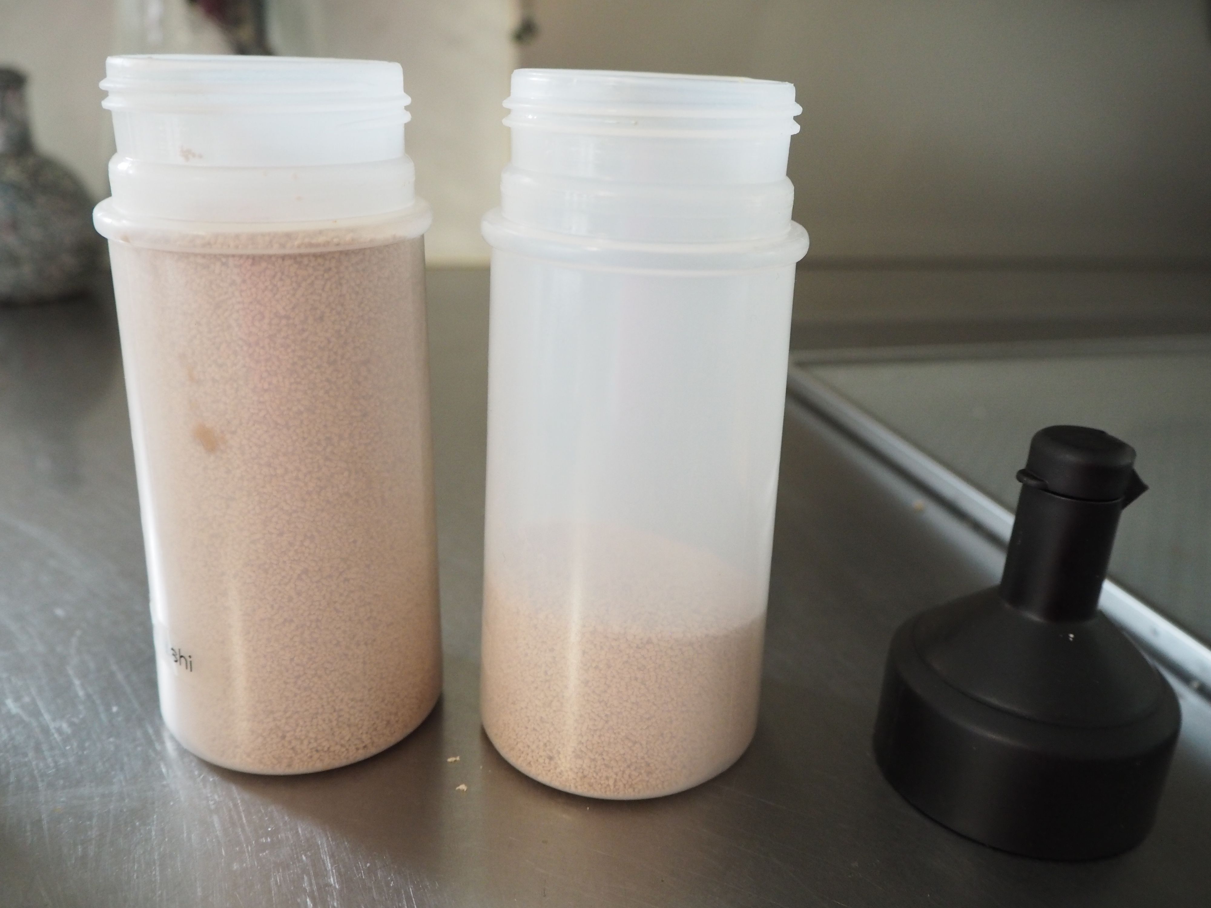 ジッパー付きの袋に入って売っているものもありますが、なかなか調理中にジッパーを留めるのが面倒だったり、湿気などであけくちがべたついたりしませんか?また、ちょっとかけるつもりが、ザーッ!とたくさん出てしまうこともありますよね?この容器ならさっと決まった量が出てくれるのでとっても便利! 120g入りのゴマのパックならまるごと1パック入ります。