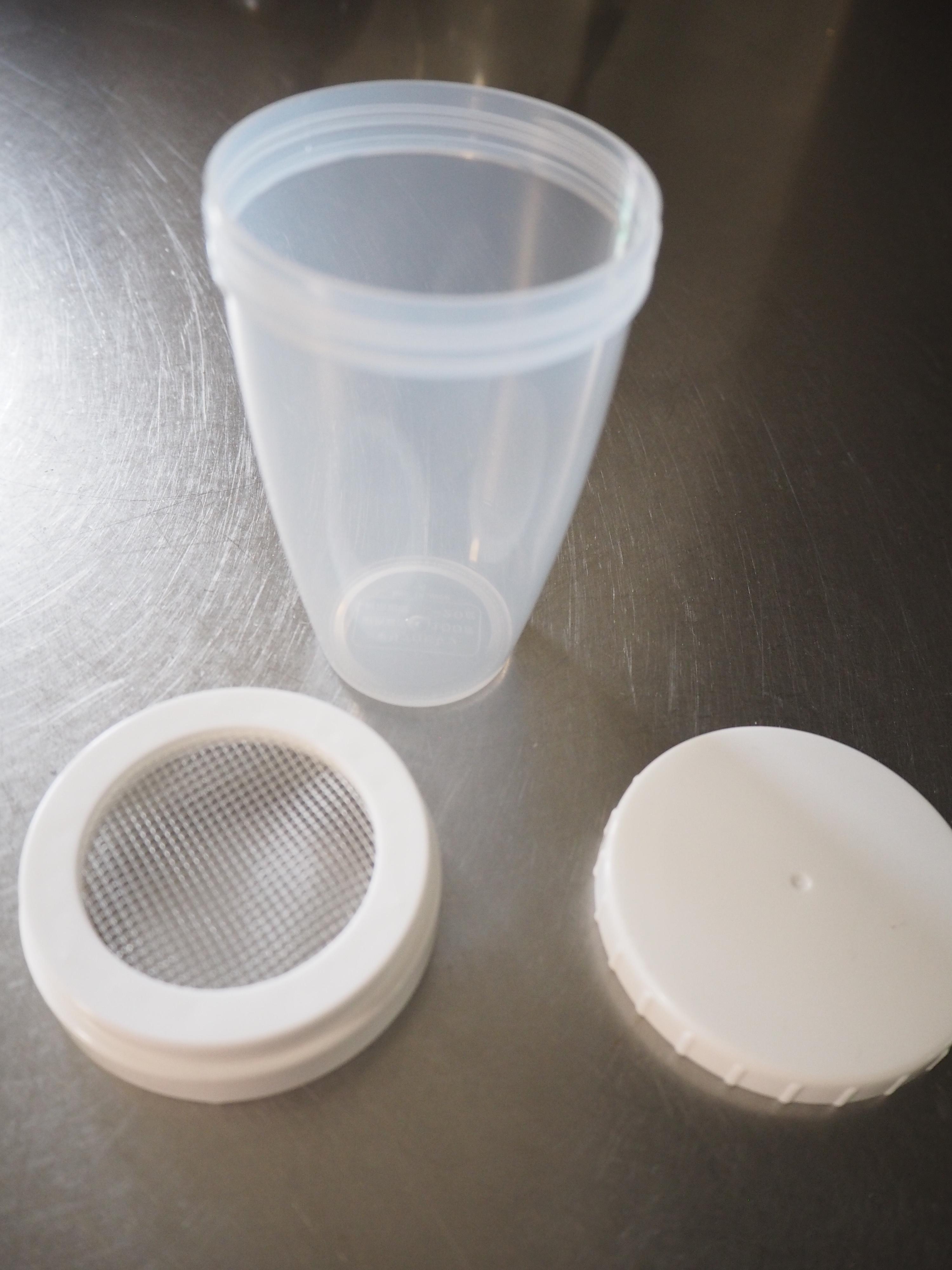 真っ白なデザインがうれしいこの容器。カップ部分と中蓋がメッシュ、さらに蓋がついた3点セット。このカップ部分に小麦粉を入れて使います。メッシュ部分で粉をセーブするので、無駄に使ったりこぼすことを防ぎます。一振りすれば小麦粉も楽々にふるえます。