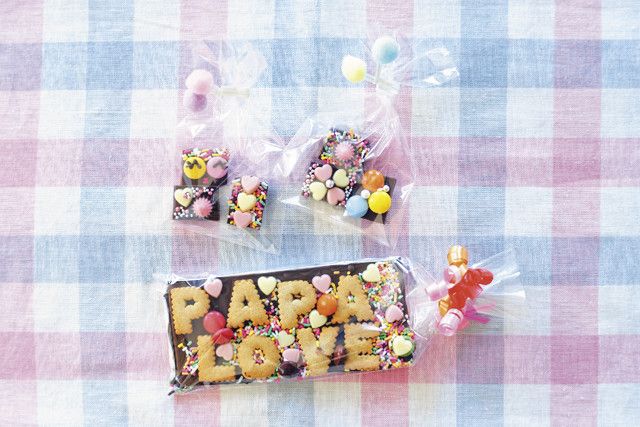 板チョコの上に、飾り用の英字ビスケットやチョコ菓子を好きなように置いていくだけだから2~3歳からでも大丈夫。親子で楽しく作ってみましょう♪