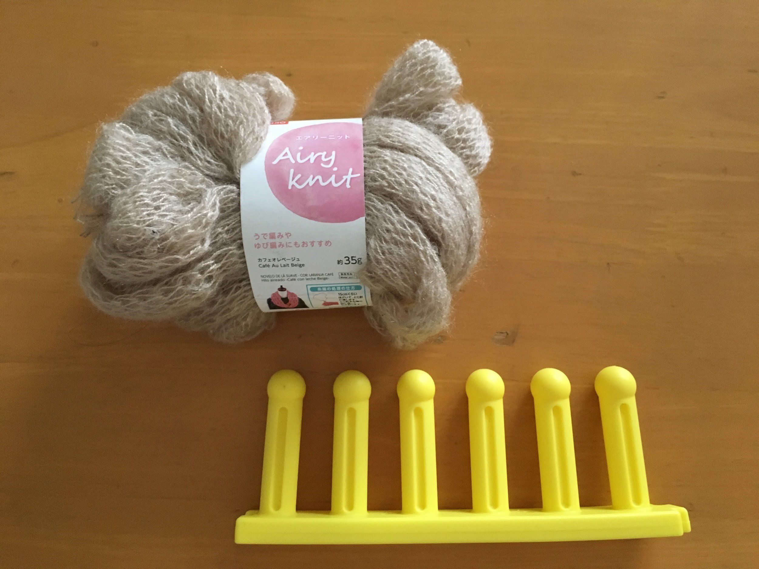 今回ご紹介するのはダイソーの「ニットメーカー」(税込み108円)。商品サイズは横幅18センチでプラスチック製。1個でも使えますが、2つ使えば連結させることも可能とのことです。利用するモヘア系の毛糸「エアリーニット」(税込み108円)もダイソーで購入しました。