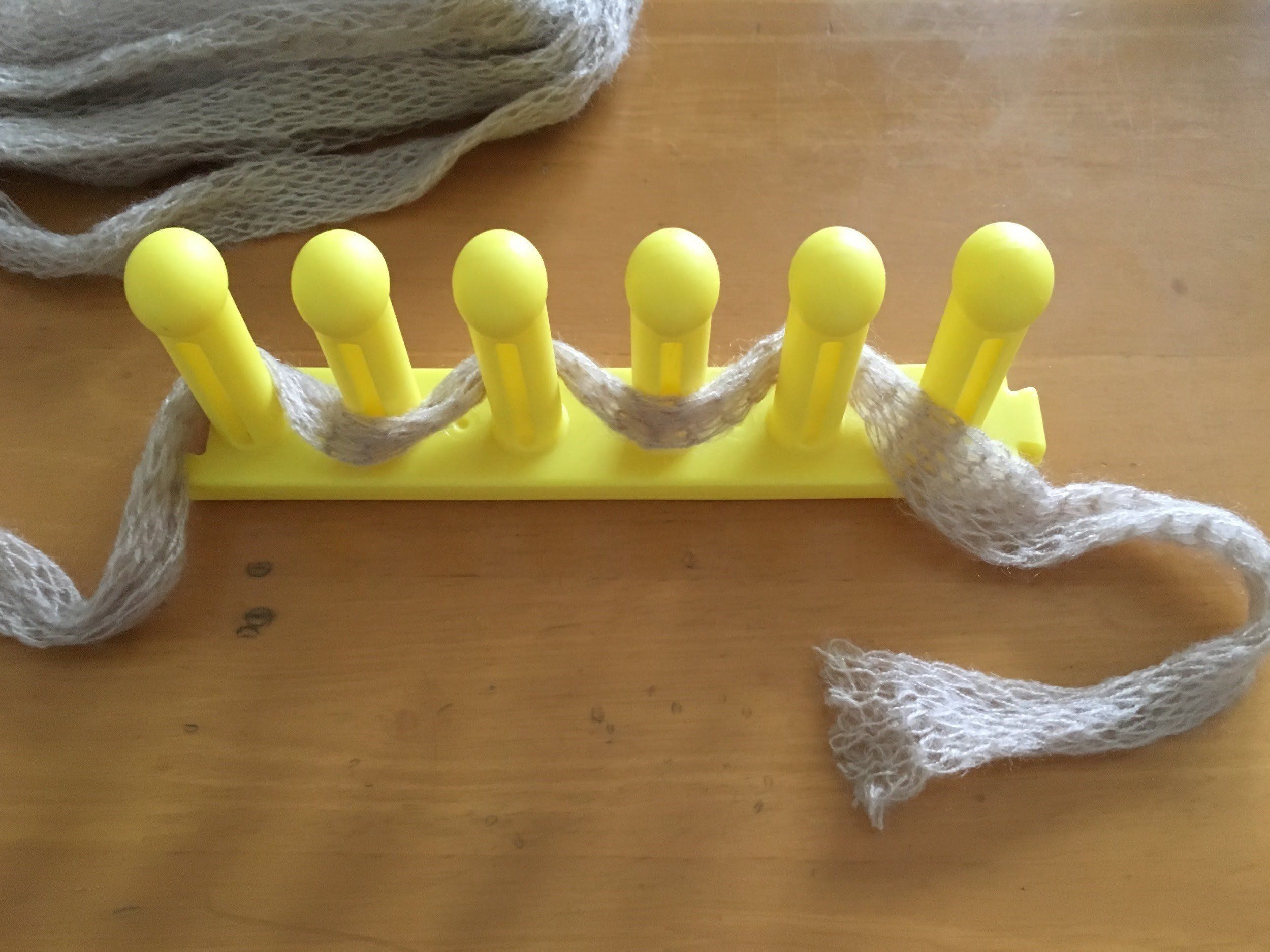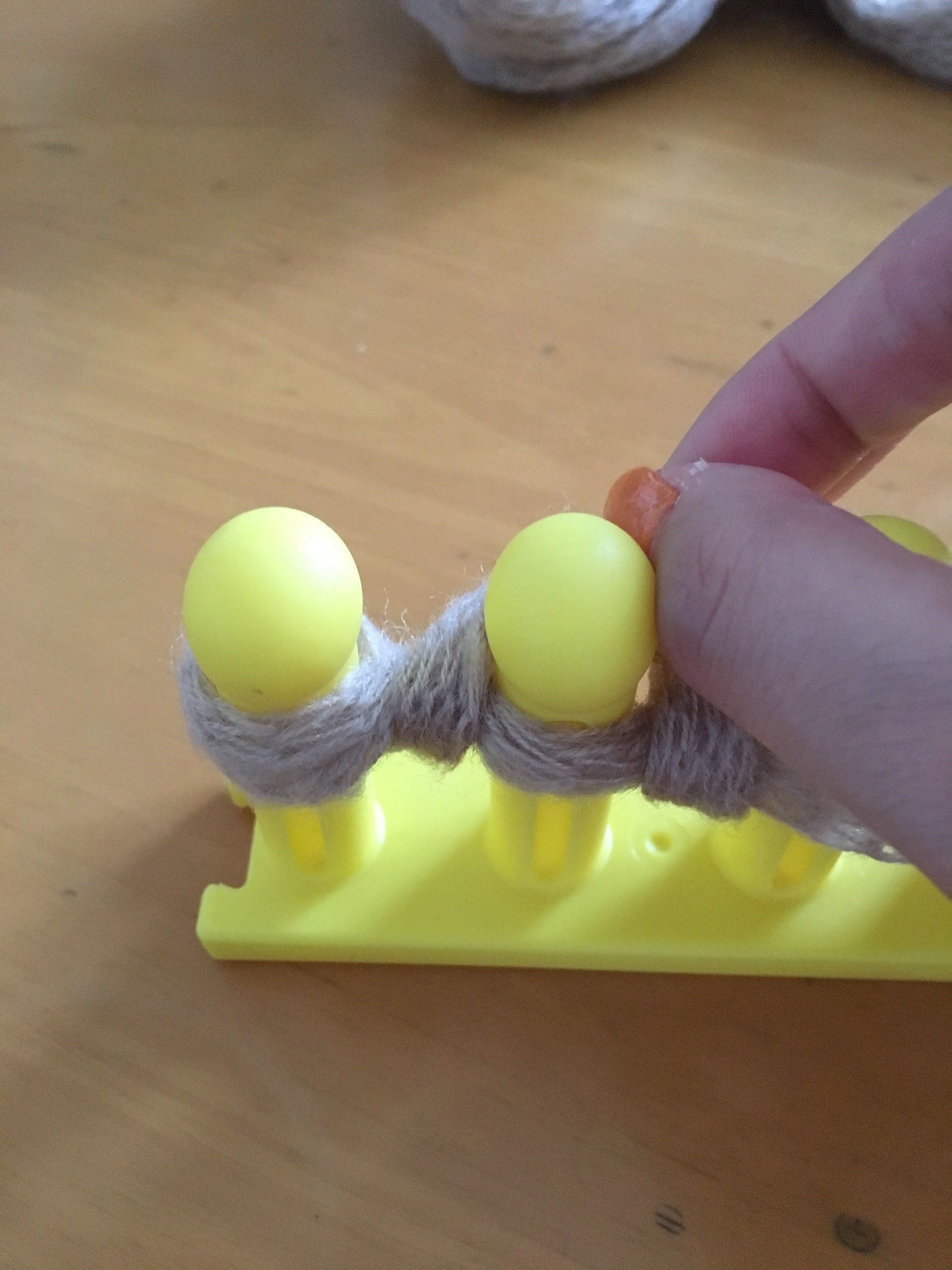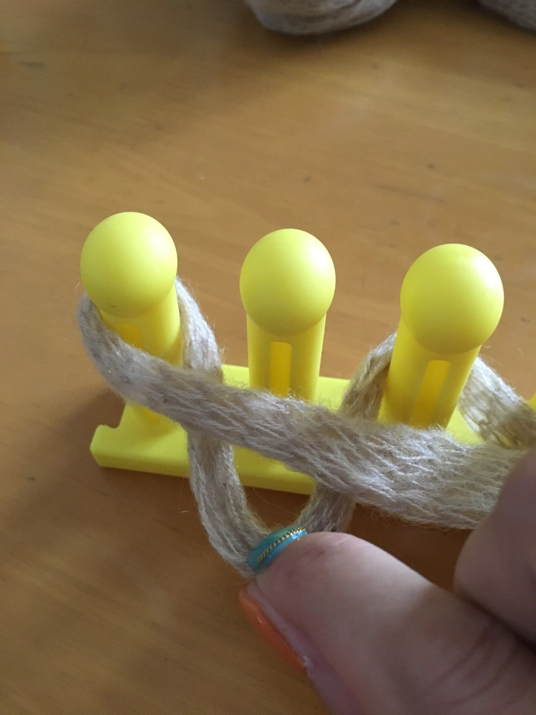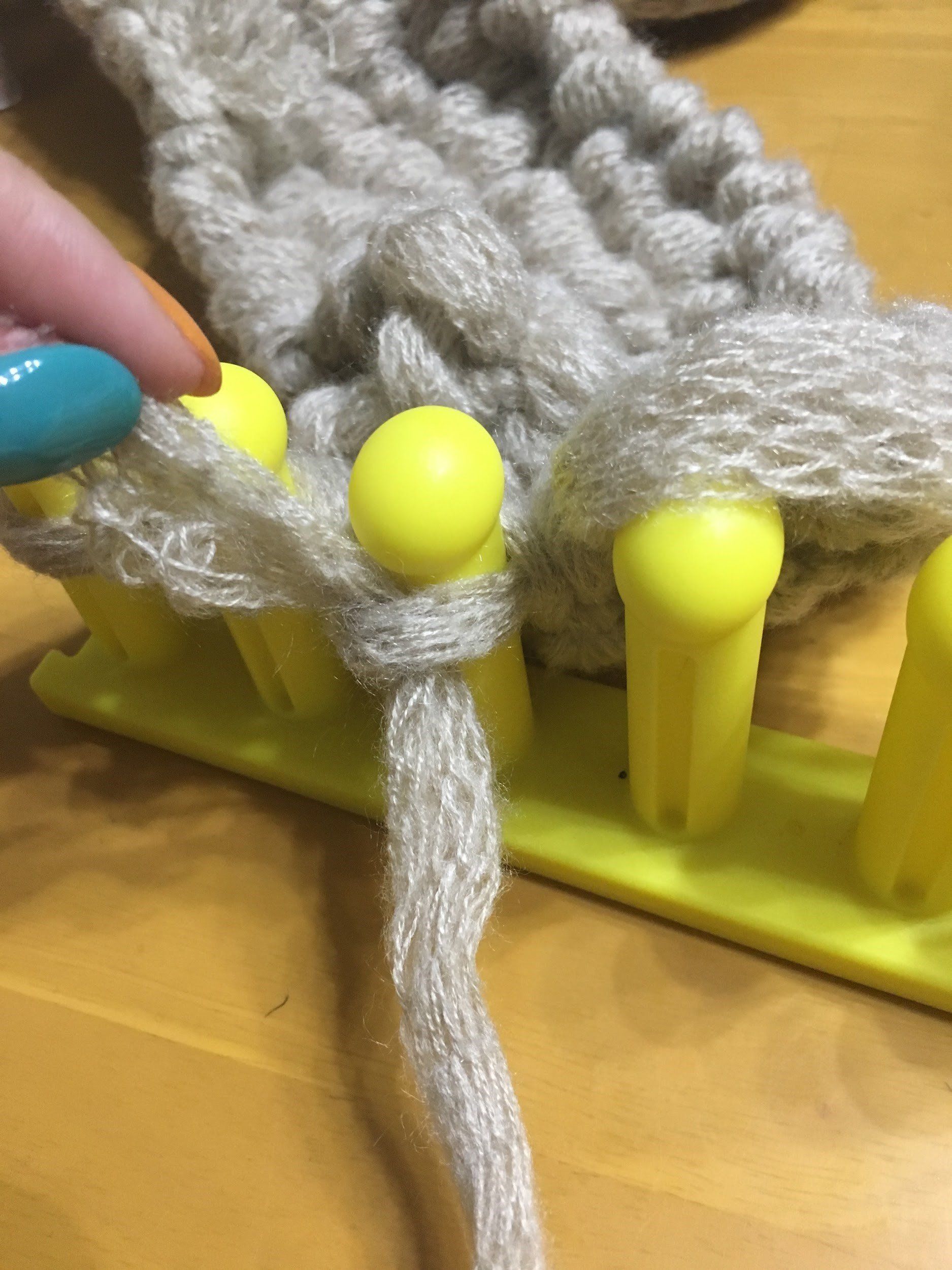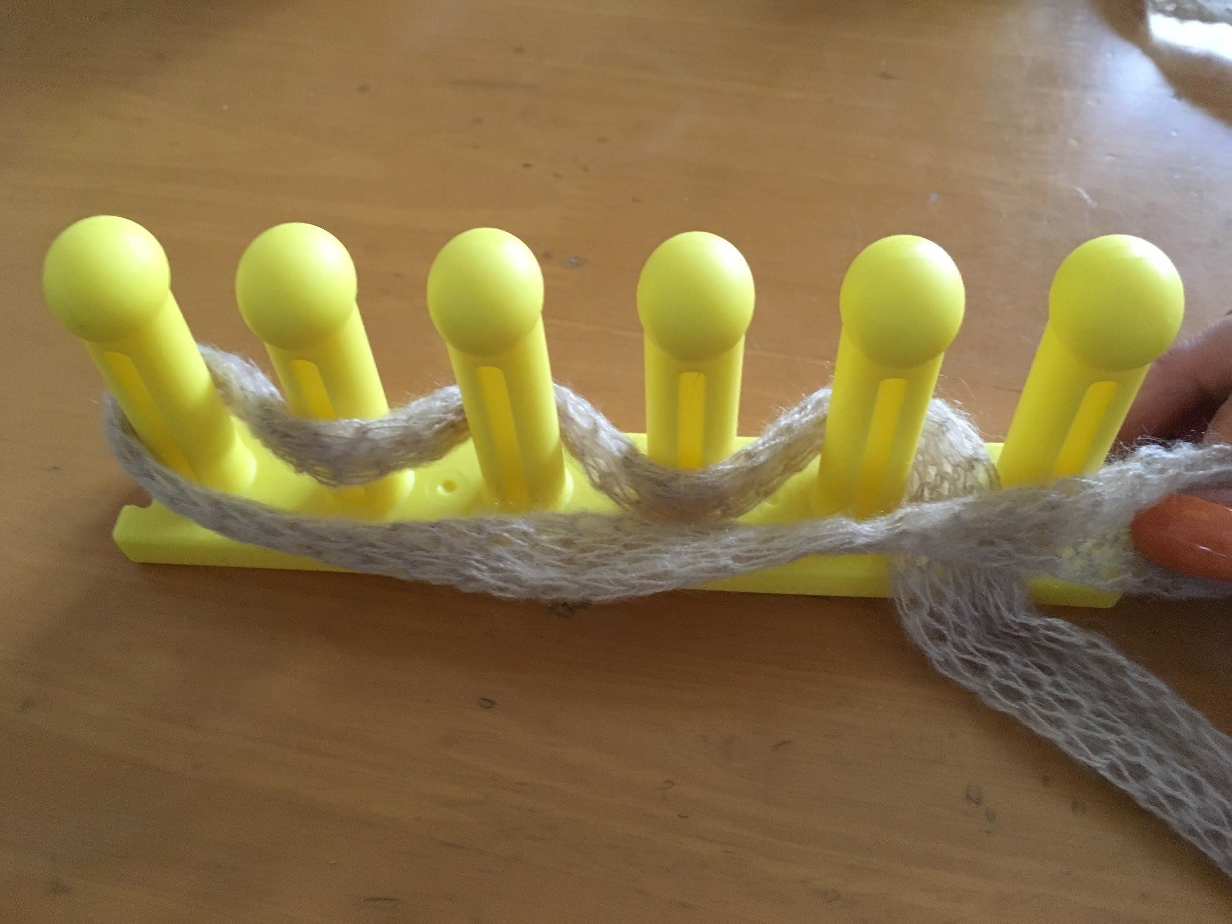 本体に立つ6本の棒部分。この棒のへこみがある方を手前に置いたら、右側から写真のように前→後の順で交互に毛糸を通していきます。この際、右側に毛糸を15センチほど残すようにしてください。左側まで通したら手前に毛糸を持ってきて、ここから編みはじめていきます。