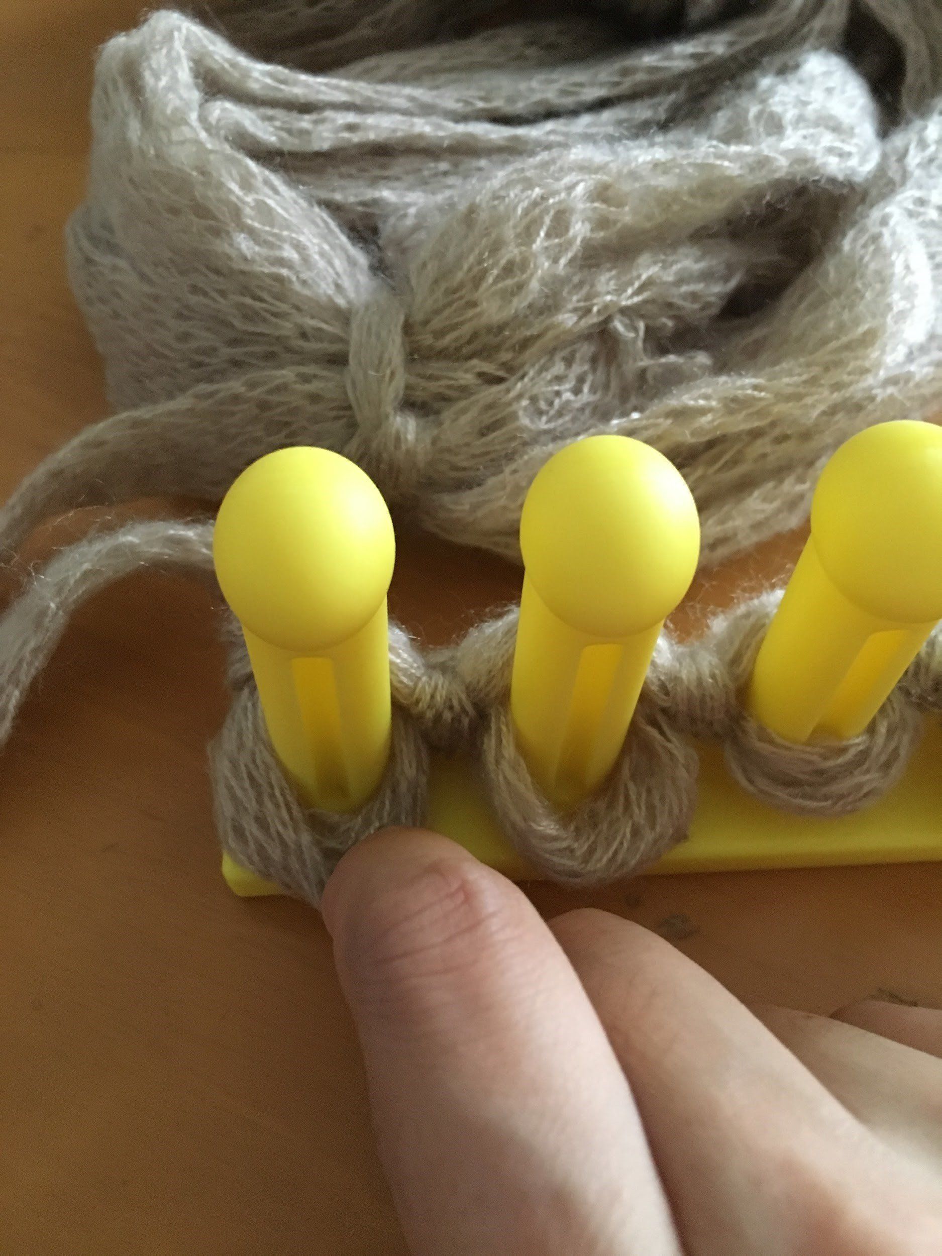 1列目は毛糸が前にある左から2、4、6番目だけを編んでいきます。初めに掛けていた毛糸を画像(上画像)のように下から引っ張り、先程手前に置いた毛糸をひっかけるようにして器具に掛けます(中央画像)。2、4、6番目の3箇所を掛け終わったら、今度は毛糸を左から右へ置きます。