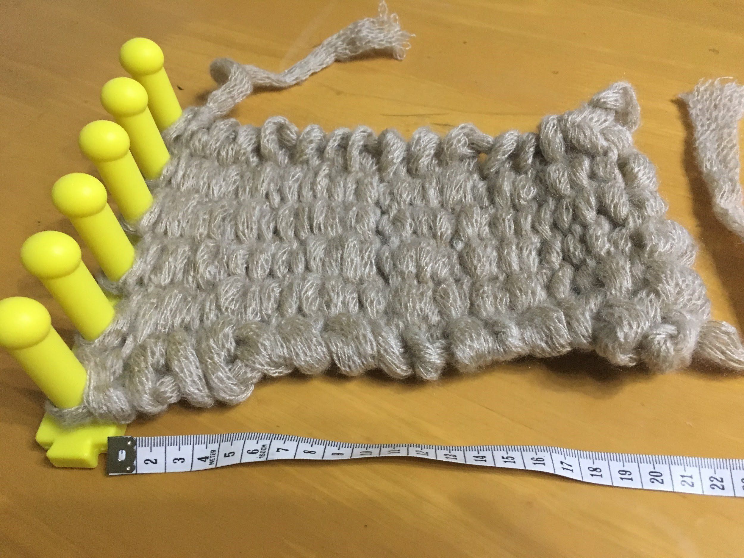 所要時間約20分で毛糸1玉編み終わりました!出来上がっている編み地で約23センチの長さです。不器用な私でもけっこう綺麗にできました。コツさえつかめば、小学生でも簡単に出来ますよ。