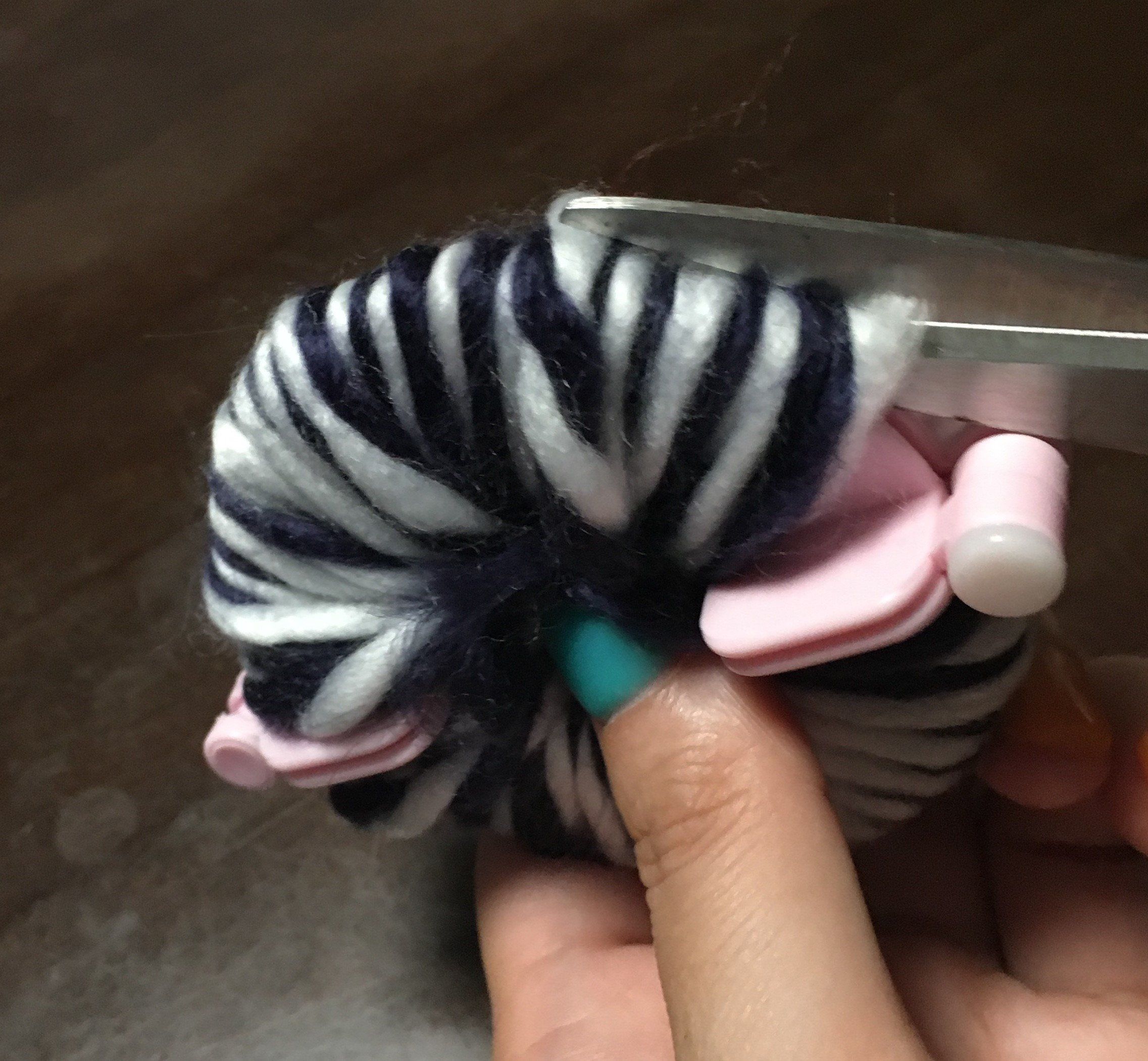最後に絞りながら結んだ毛糸も含めて、ハサミを使って長い部分を切っていき、全体的に丸くなるよう形を整えます。