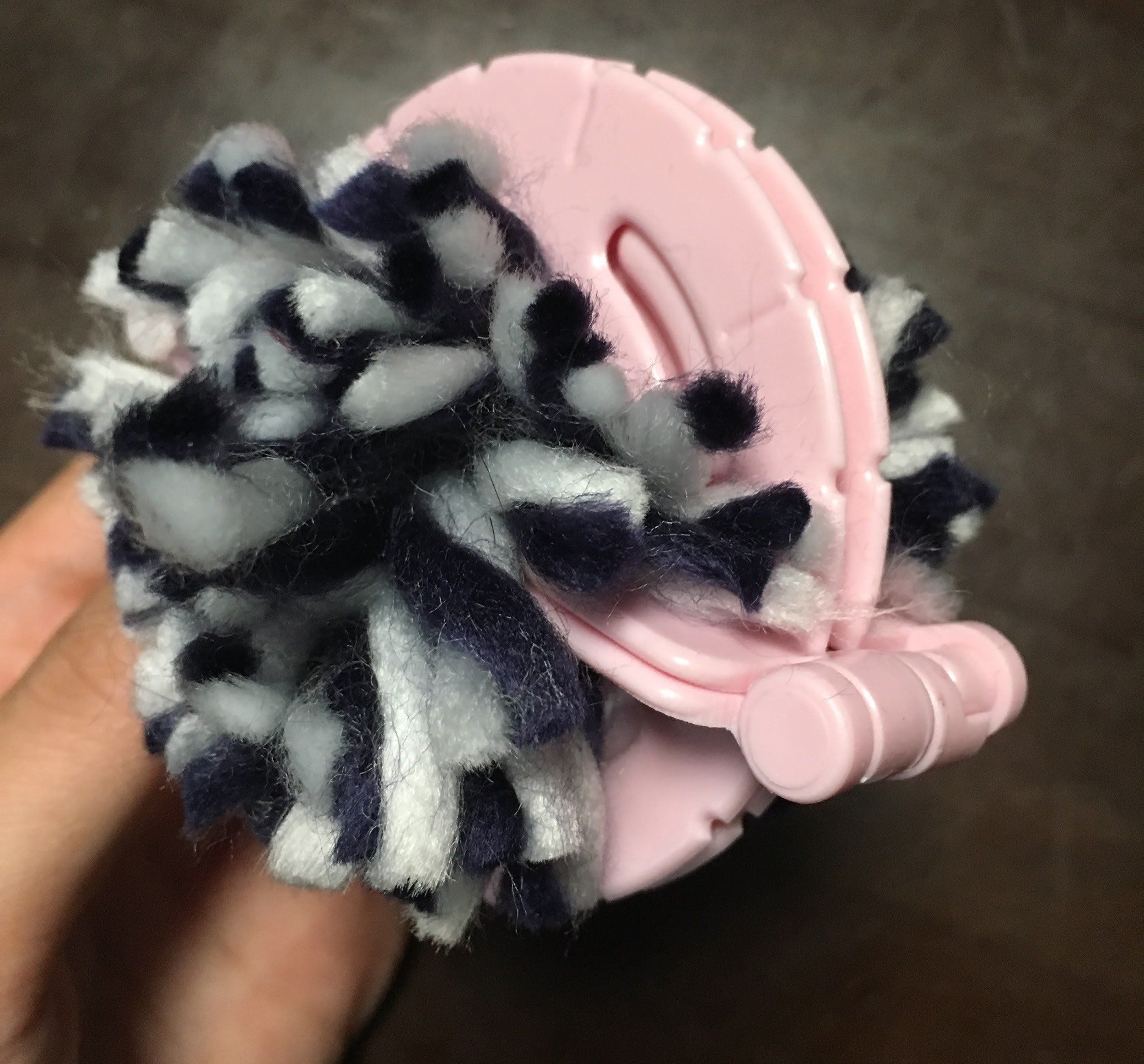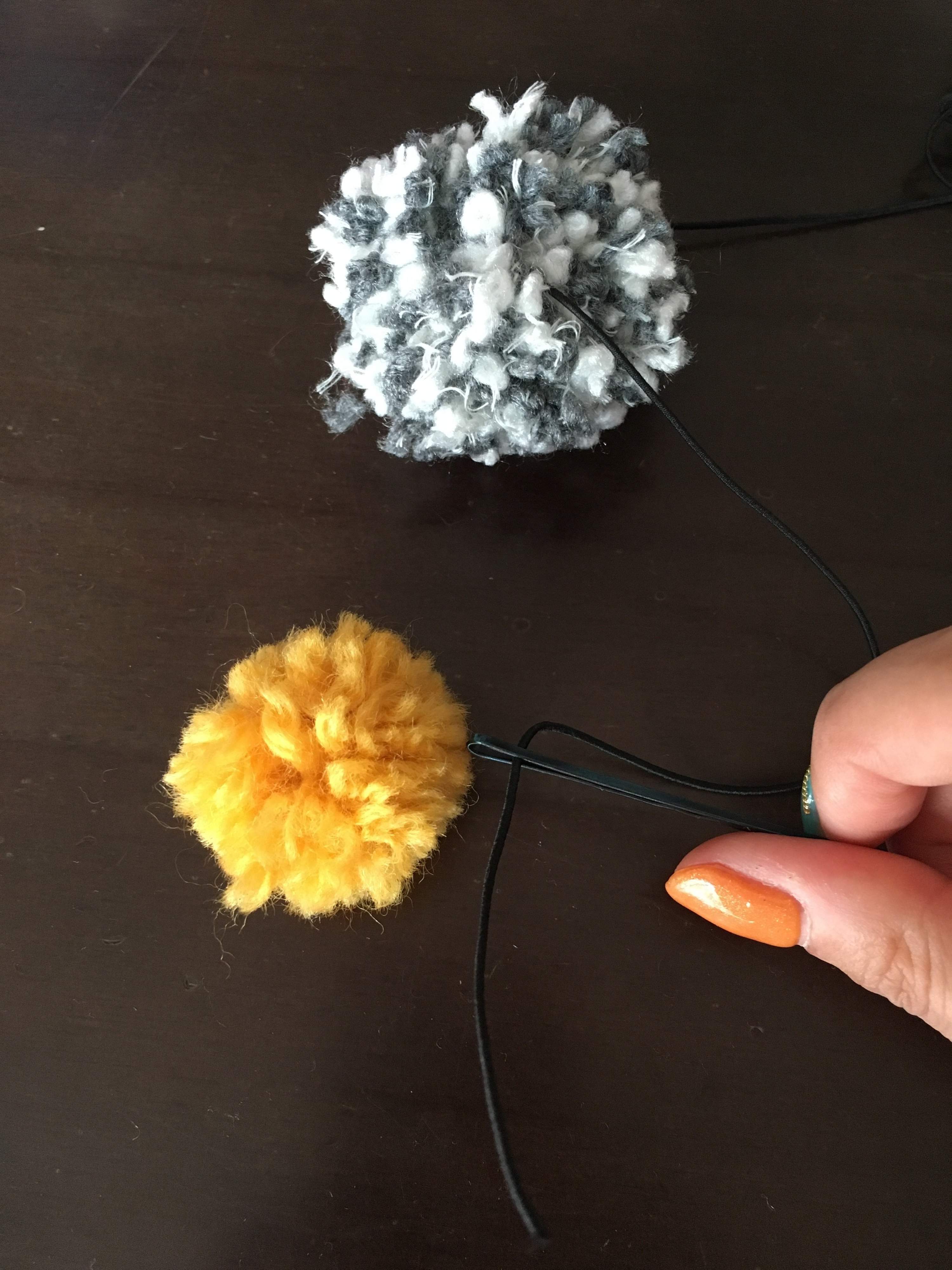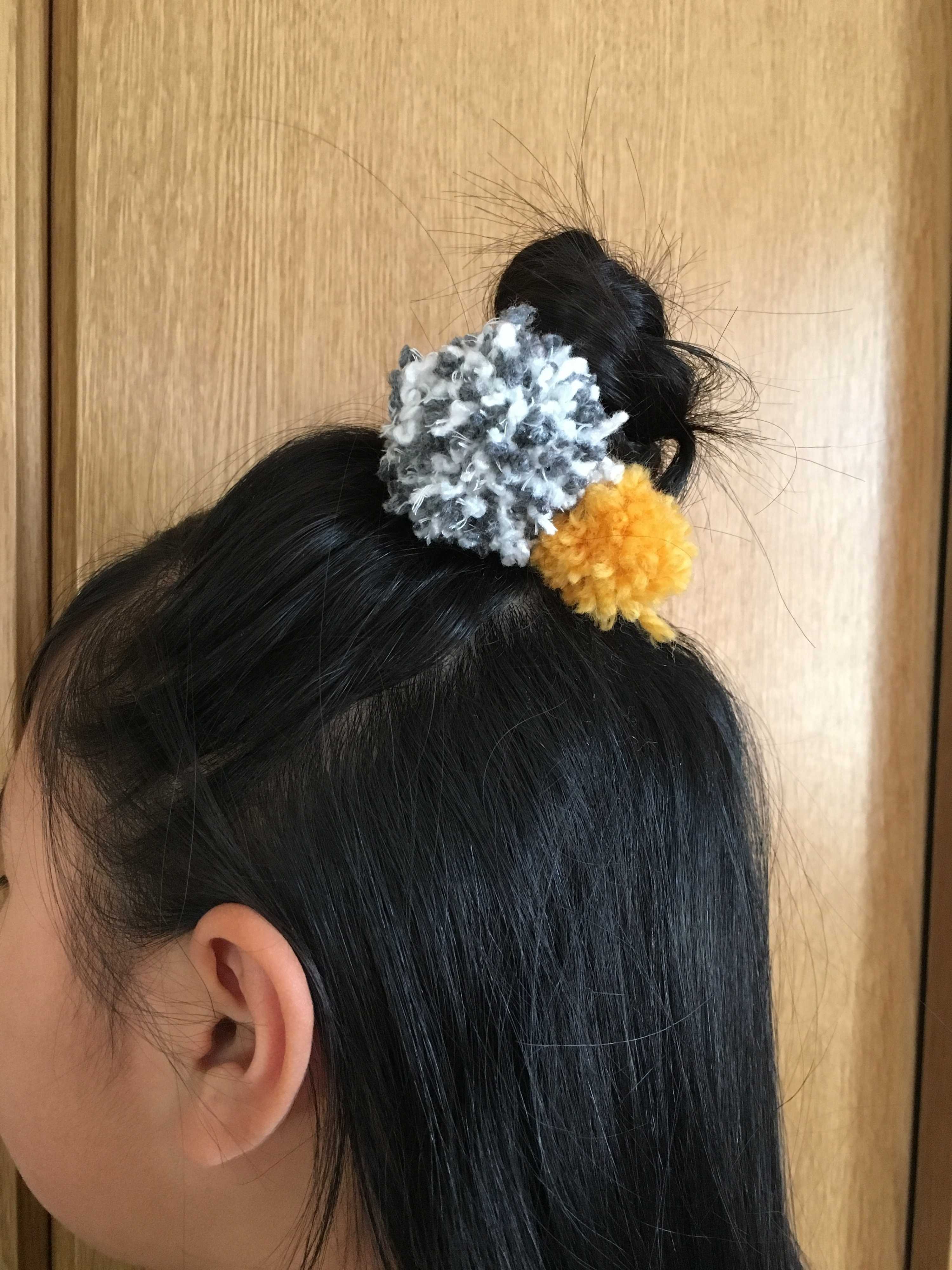 ゴムを通して、ボンボン付きのヘアゴムに。ヘアピンにゴムをかけてボンボンに刺していくと簡単に通ります。15センチ位の長さで切り、端同士を結ぶと可愛いヘアアクセが出来上がりました。