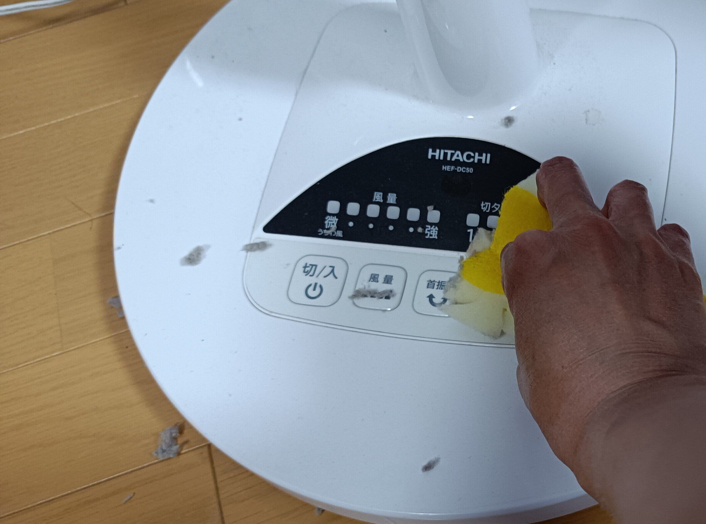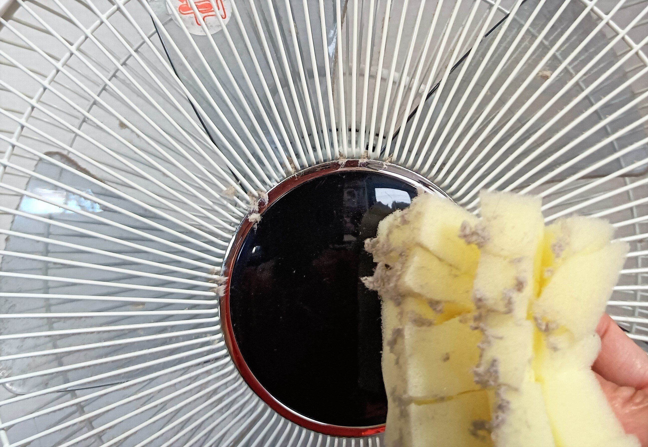 このようにホコリがたっぷりたまってしまった扇風機を、切り目をいれたスポンジで軽くこすっていきます。