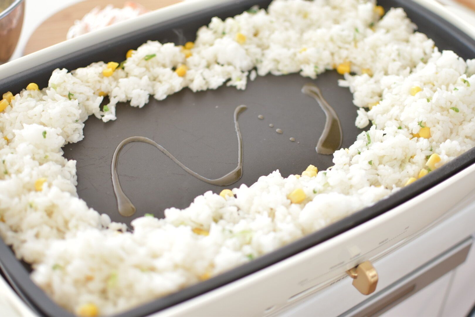 4.チャーハンの真ん中を空けて堤防を作ります。ごま油をなじませたらホットプレートの温度を強にして卵を一気に加え、菜箸でかきまぜて蓋をしめます。
