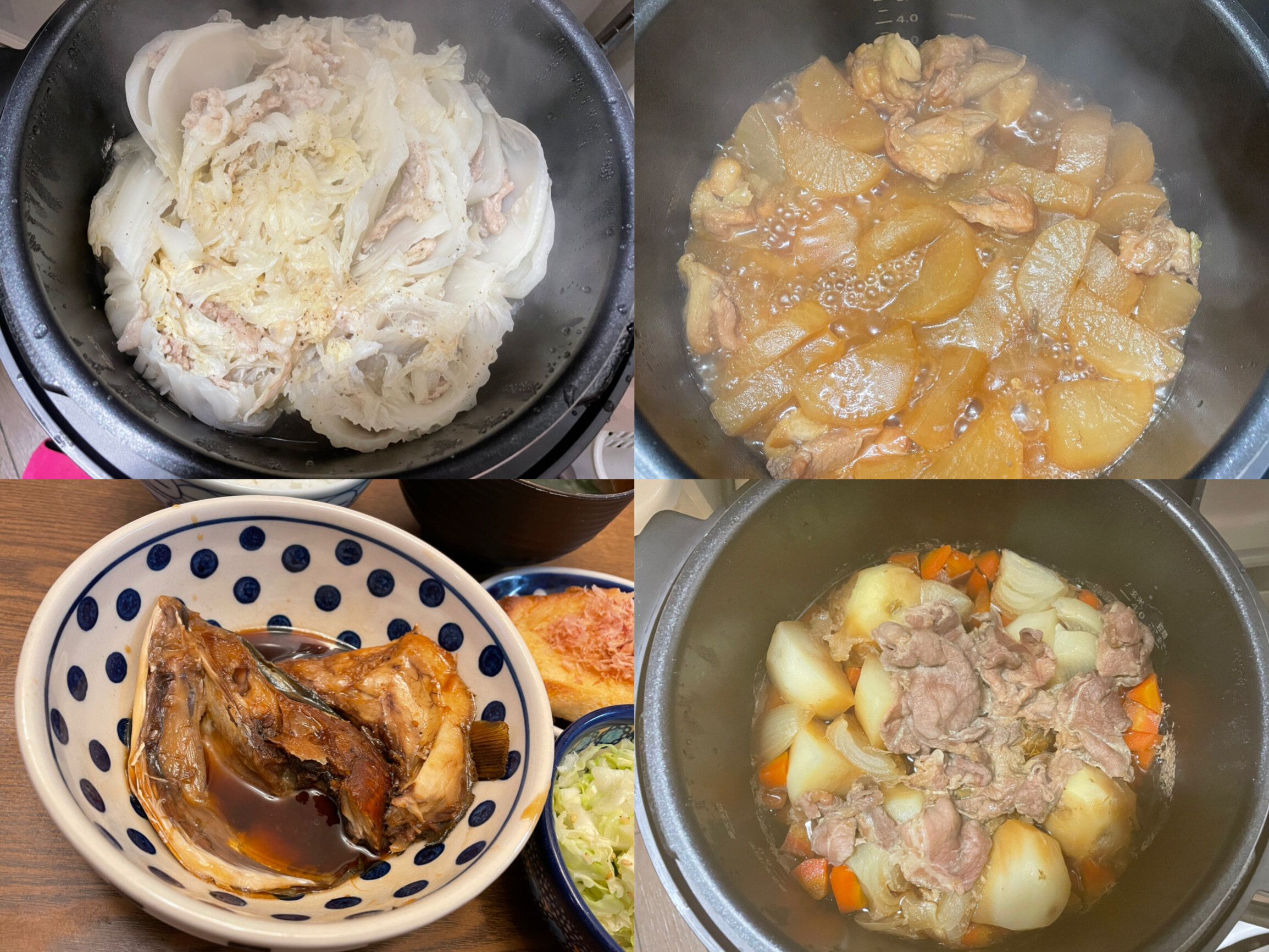 白菜のミルフィーユ煮、大根と鶏ももの煮物、魚のアラの煮つけ、肉じゃが。どれも材料と調味料を入れて自動調理スイッチオンで完成。