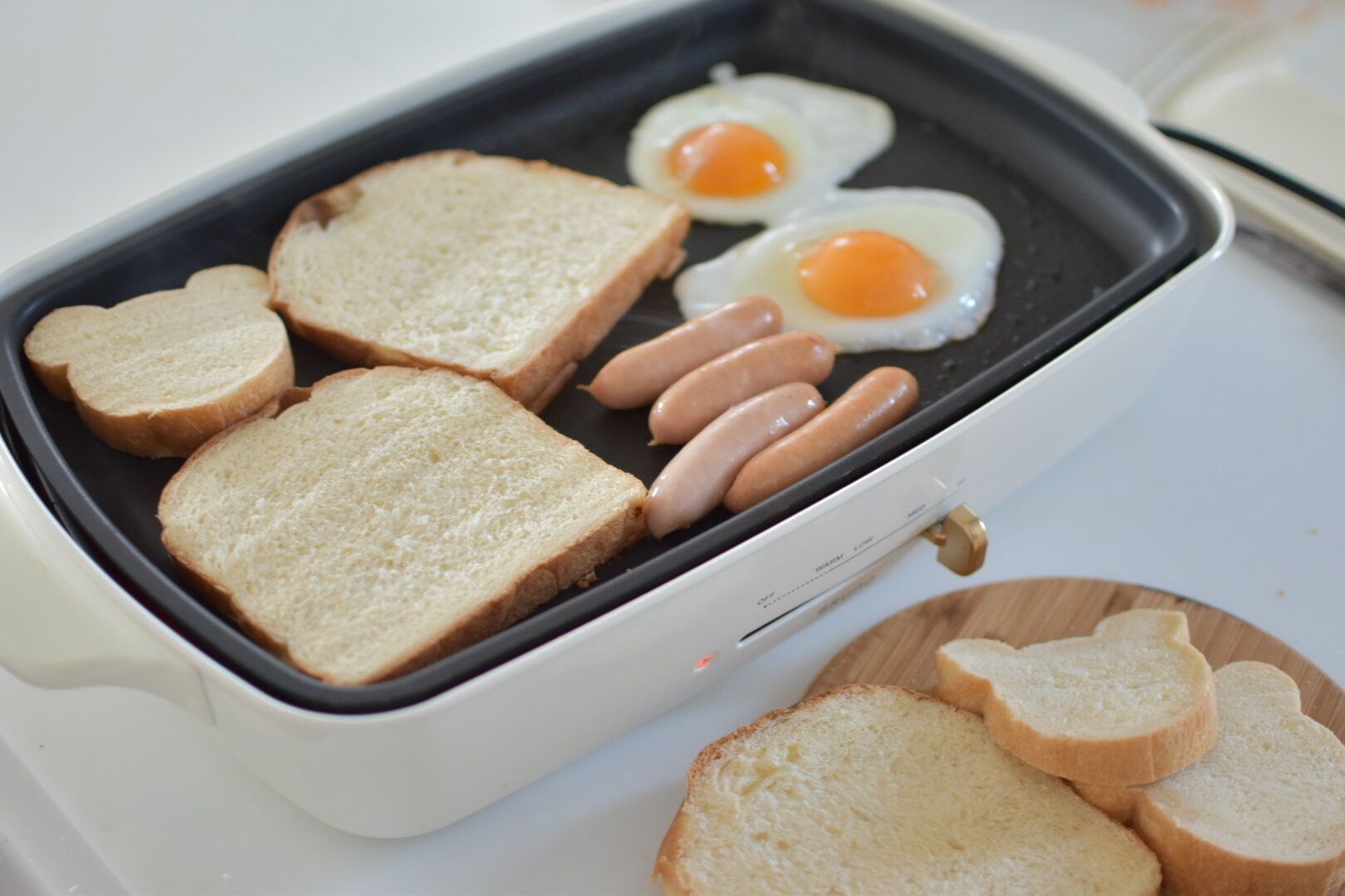 休日に限らずですが朝食こそホットプレートがあると助かります。起きてくる時間がバラバラでも大丈夫。好きなタイミングで食べられるのが最大の強みです。目玉焼きやウインナーが焼けるのはもちろんですが、食パンのトーストも可能。