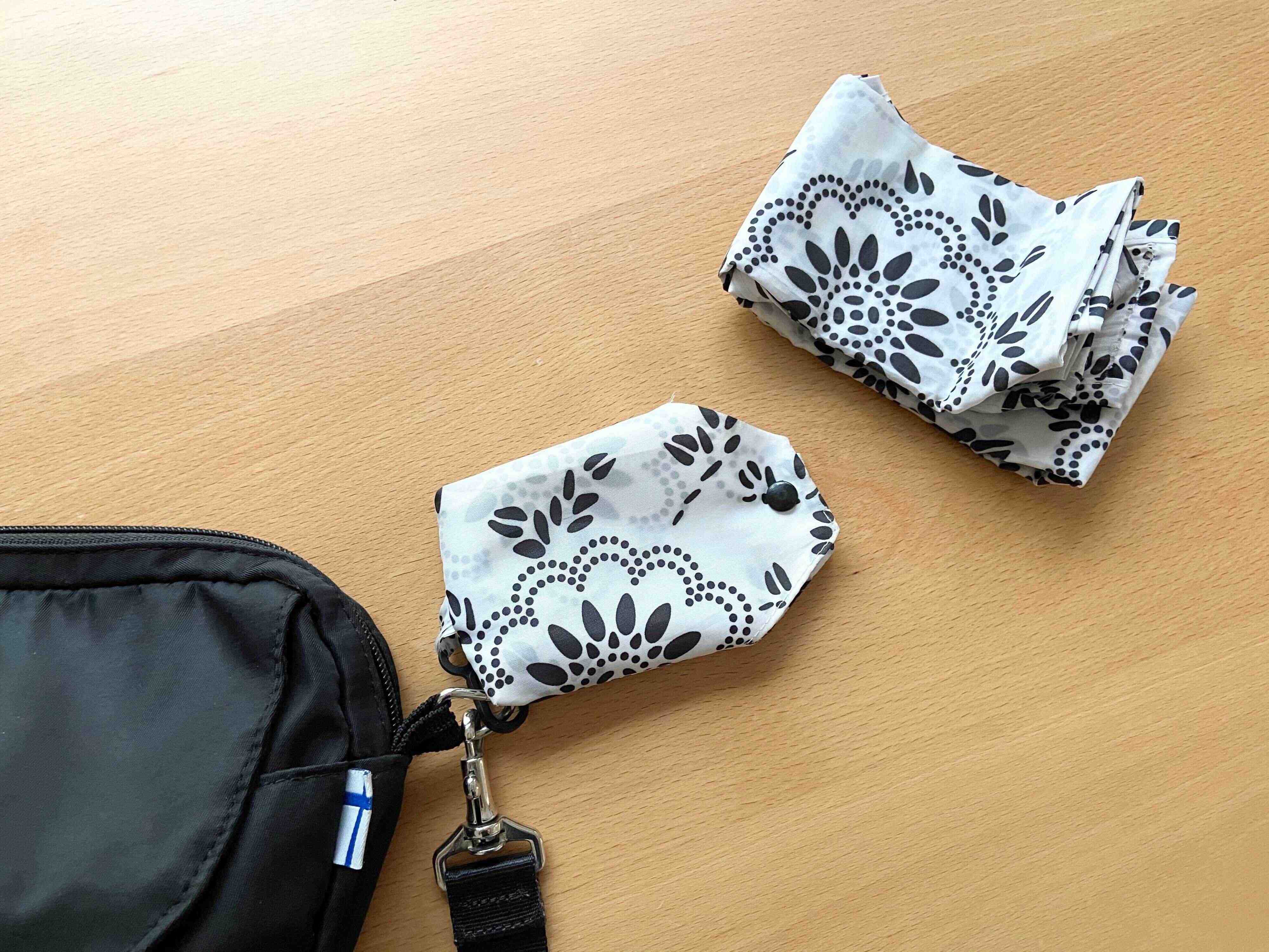 こちらの商品はナイロン製の折りたたみ式で、たたんだ状態で肩かけバッグなどに吊るすことができます。また、モノトーンのデザインは、常時バッグにつけていても悪目立ちしません。
