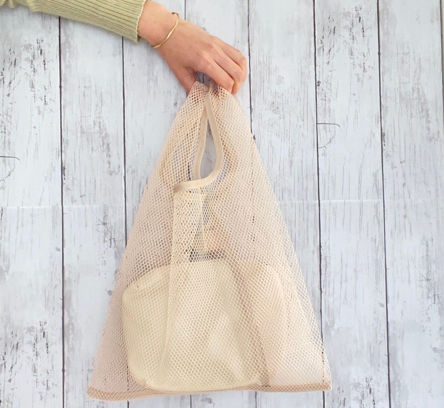3COINSのメッシュバッグはシンプルなホワイトの色味で、サブバッグやファッションの一部としても違和感なく馴染みます。メッシュのためシワを気にせずに、使わないときはくしゅくしゅと丸めてバッグの中に入れても問題ありません。