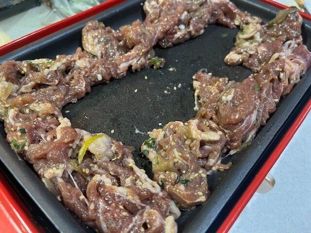いつもの味付け肉もホットプレートでごはんと一緒に焼けば一気におもてなし感が出ます。