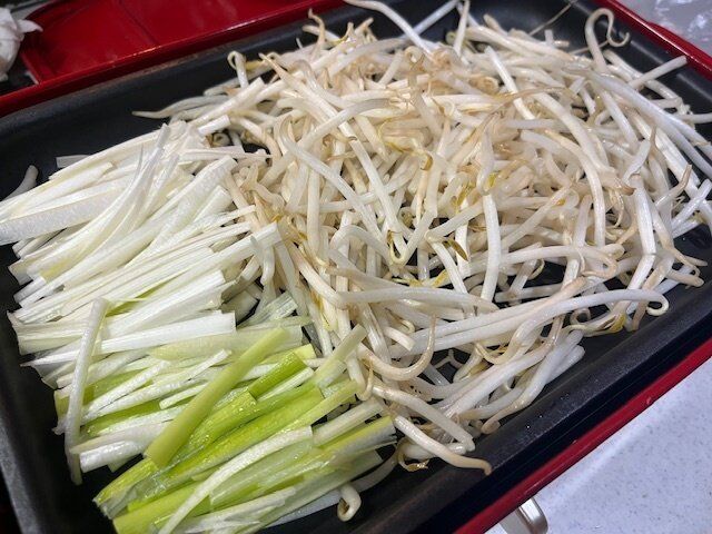 次はこちら。ホットプレートいっぱいに好きな野菜を敷き詰めます。今回はしゃぶしゃぶにもぴったりのもやしとねぎを用意しました。