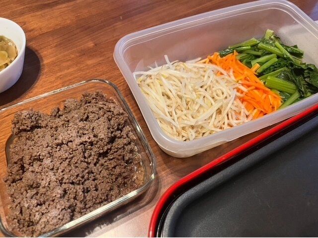 まず、ビビンバの具材を用意します。肉そぼろ、ナムルを作りました。