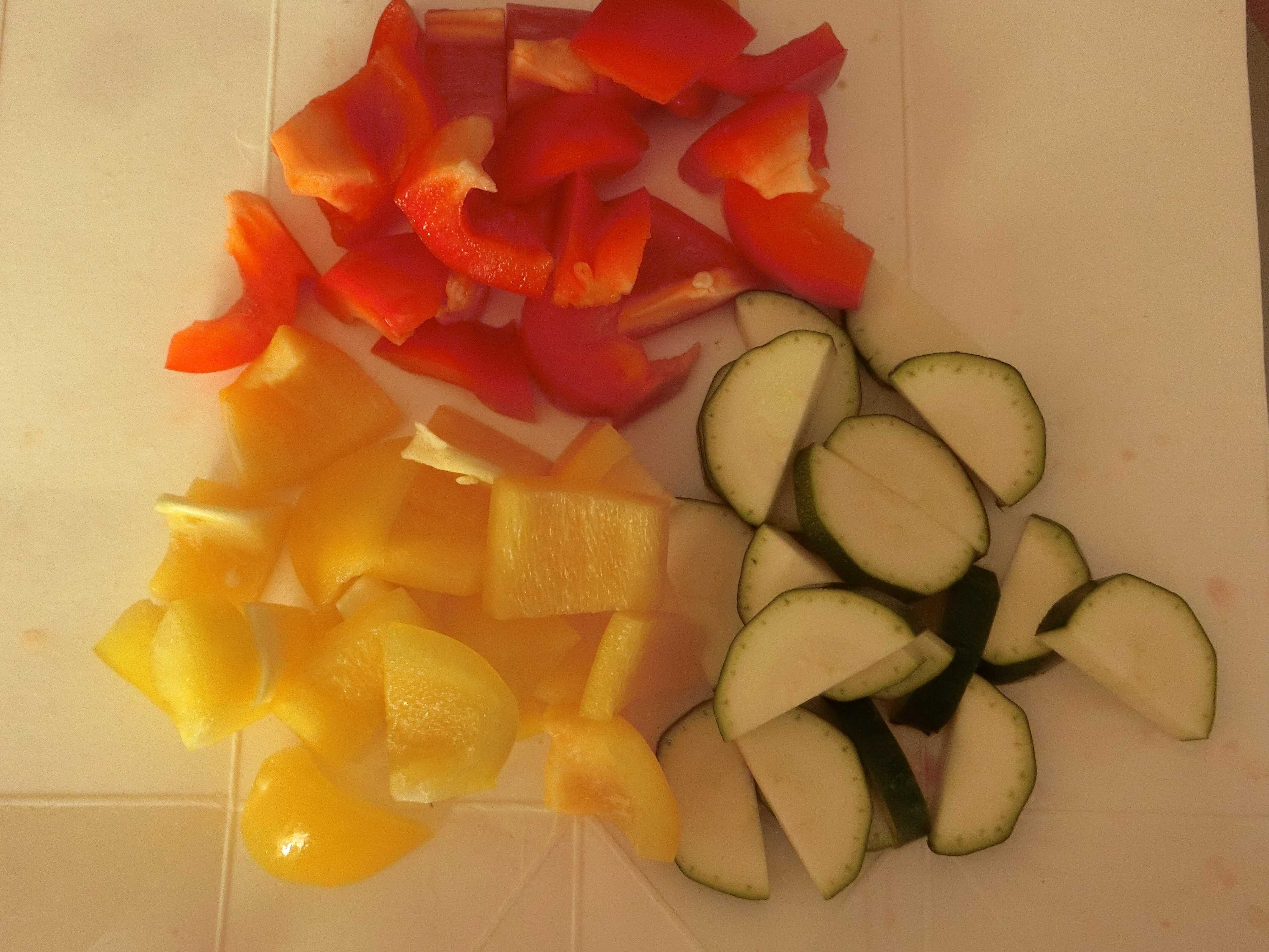 1.パプリカは2cm角にし、ズッキーニは5mm幅の半月切りにします。