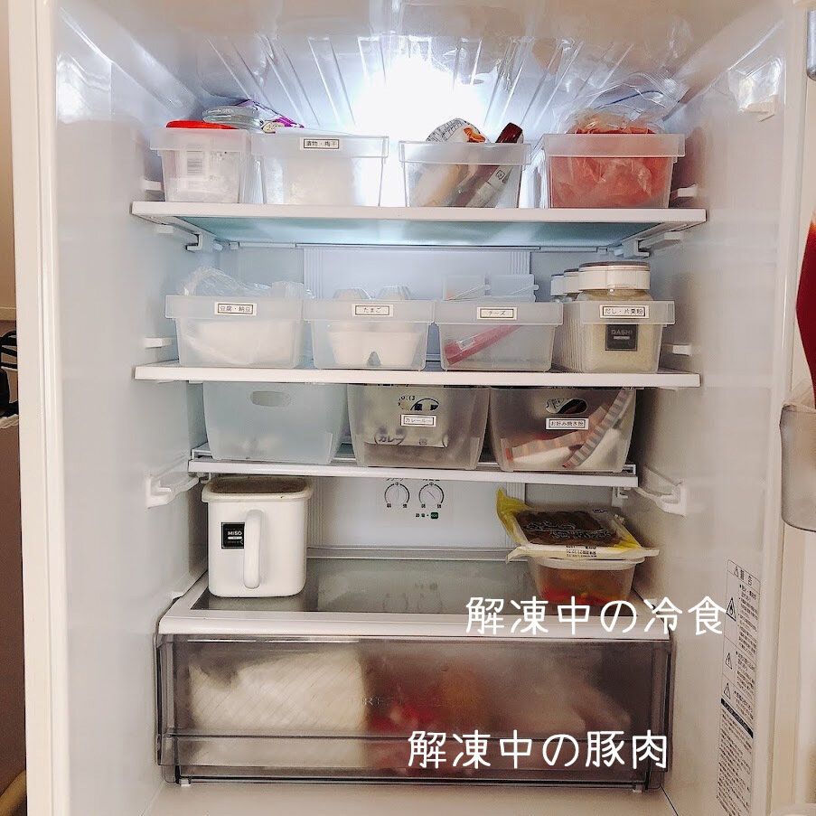 今日食べる予定の豚肉と冷食(あじの南蛮漬け・冷凍パプリカ)は冷蔵庫で解凍中。