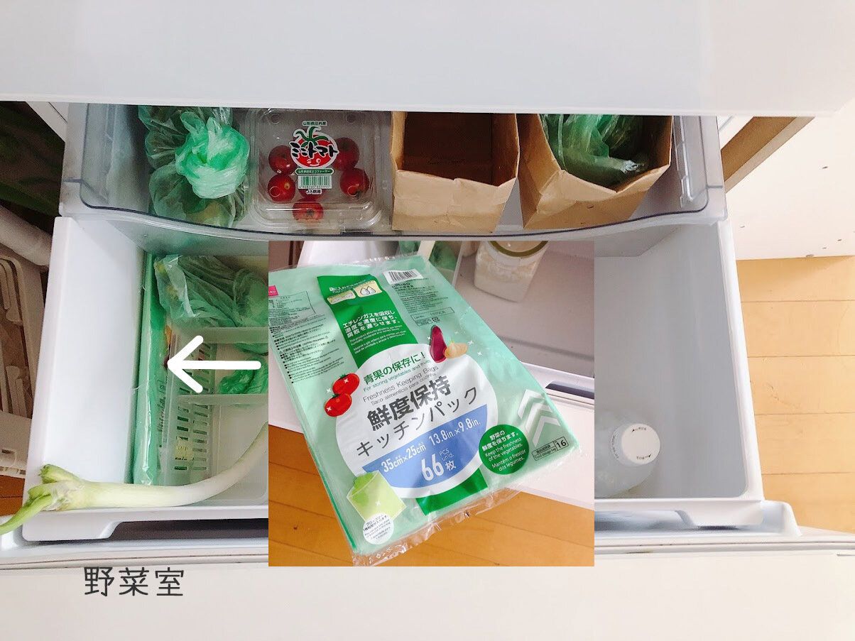 野菜室に収納もしちゃってるのは鮮度保持キッチンパック(ダイソー)という袋。