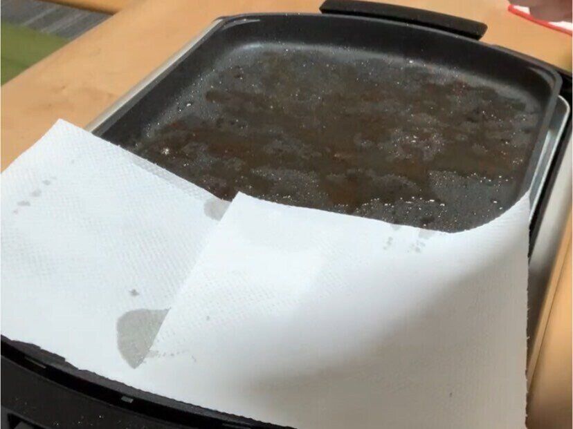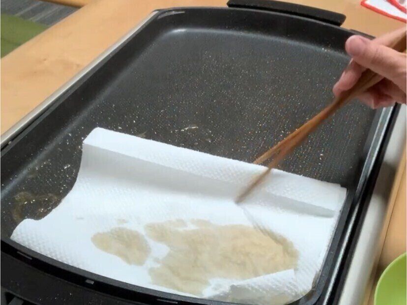 熱で油が浮き、その油をキッチンペーパーでふき取っていきます。手で触ると熱いので、必ず菜箸などをご使用ください。ホットプレートの水分がなくなるまでしっかりとキッチンペーパーでふきとってくださいね。おもしろいくらい油汚れが取れていきます!!