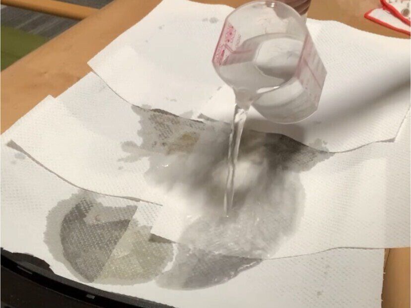 温まっているホットプレートにお湯を入れるとシュワーと音がします。油は熱に弱いですよね。そして、キッチンペーパーは油を吸収してくれますよね。このふたつの特徴を活かしてきれいにしていきます。
