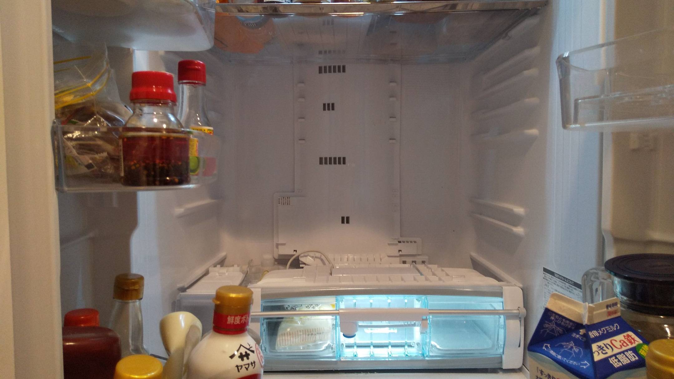 意気揚々と冷蔵庫の扉を開け、チルドルームの真上の棚に並べた食材を押し分けながら穴を探すも、穴などない・・・