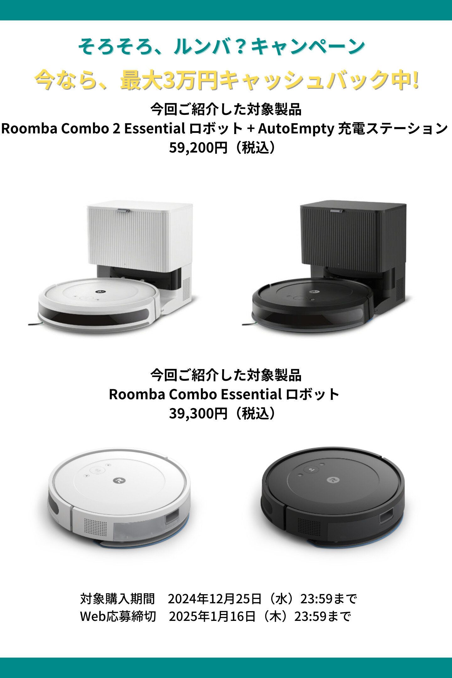 対象購入期間中に「Roomba Combo 2 Essential ロボット + AutoEmpty 充電ステーション」「Roomba Combo Essential ロボット」をキャンペーン実施店舗(認定販売店、アイロボット公式ストア、楽天市場店、Yahoo!店)で購入し、期間中に応募すると、5000円がキャッシュバックされるキャンペーンを実施中! このお得なタイミングを逃す手はない!