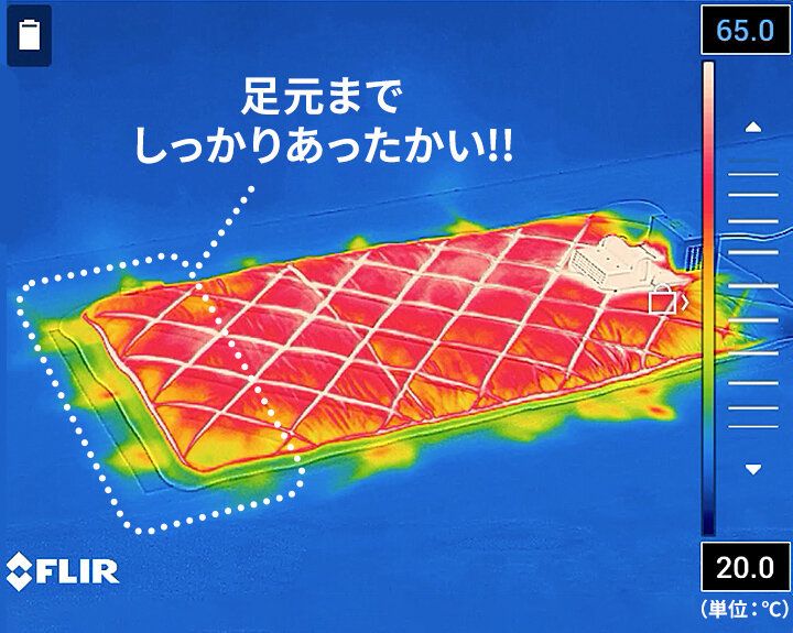 ※「RF-UA10」で乾燥「冬50」コース運転開始約30分後の掛けふとんをめくった状態。室温20℃のサーモグラフ(象印調べ)