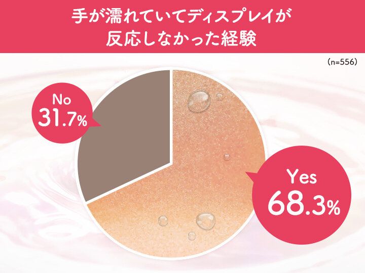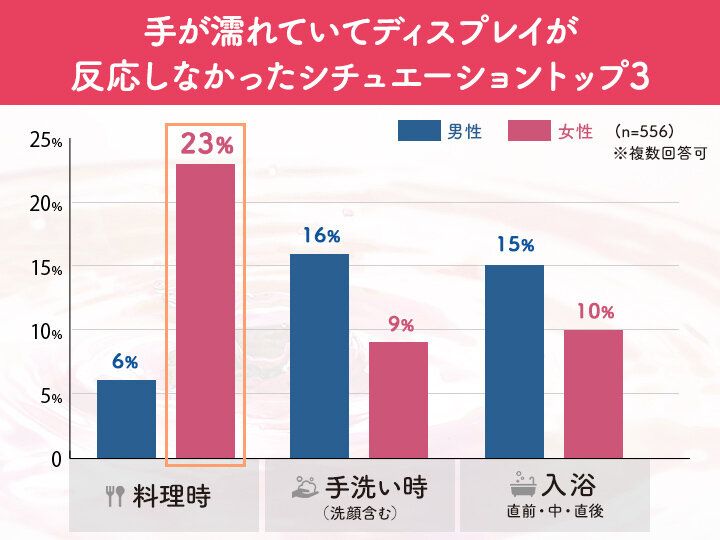 スマホに関するアンケートを556名に行ったところ、約7割の人が手が濡れていてディスプレイが反応しなかった経験があり、そのうち女性の約4人に1人が料理時でのシチュエーションが多いと答えていることがわかりました。