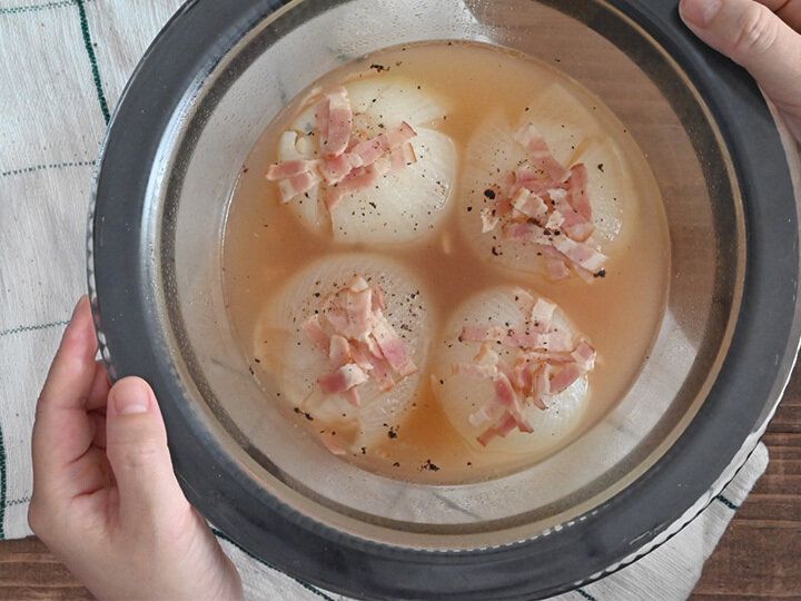 「EVERINO(エブリノ)」付属のボウルセットに、上下を切り落とした玉ねぎを入れてふんわりラップをかけ、庫内にセット。まずは7分、「うきレジ」でチン。一度取り出して、ベーコン、水、コンソメ顆粒、バターを入れてさらに、「うきレジ」で25分。塩・こしょうで味を調えたら出来上がり。