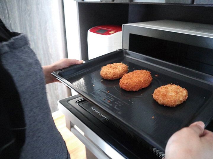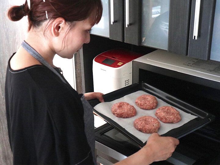 ハンバーグの材料をこねて成形したら、「『EVERINO(エブリノ)』の角皿にクッキングシートを敷いて並べます。庫内にセットし、使ったのは「レジグリ」機能。約150gのボリュームあるハンバーグが4人分なんと約13分後に出来上がりました!(※1)