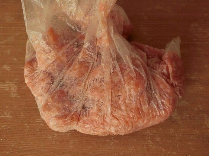 2.ひき肉とAの調味料をポリ袋に入れ、よく混ぜ合わせます。混ざったら玉葱も入れてさらに混ぜ合わせます。