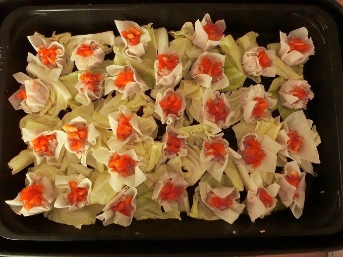 4.キャベツをホットプレートに敷き、焼売を並べます。パプリカを乗せたら水を入れ、蓋をして7~10分蒸し焼きにして完成。