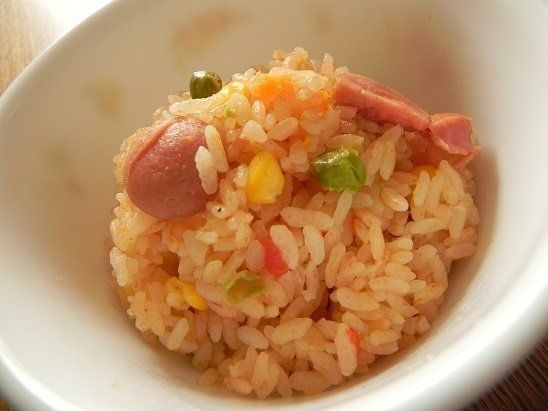 2.炊飯器にお米とケチャップ、コンソメ、塩こしょうを入れ、3合のメモリまで水を入れたら1とミックスベジタブルを入れます。