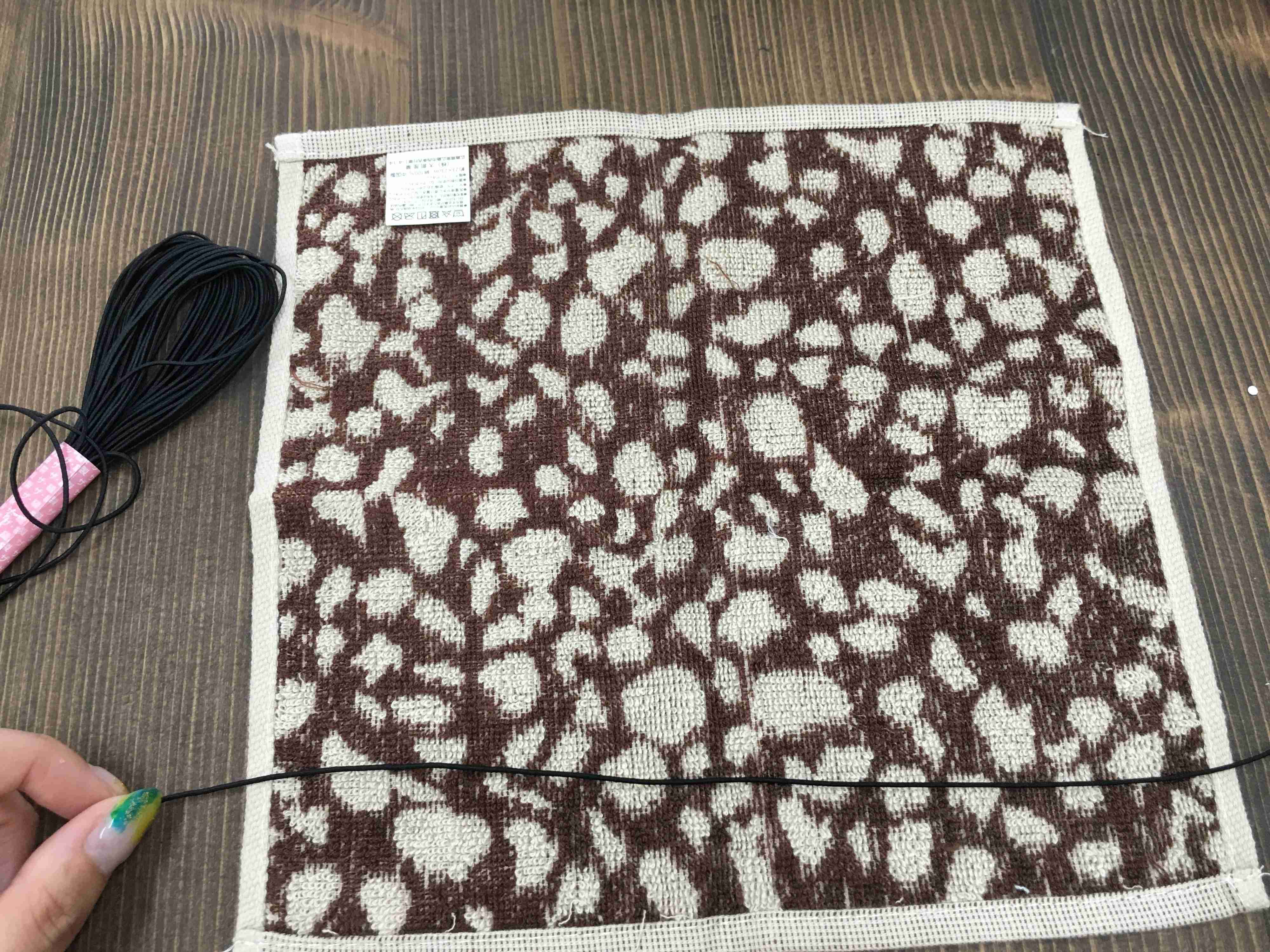 1.ミニタオルを裏返して丸ゴムを一辺の端に乗せます。