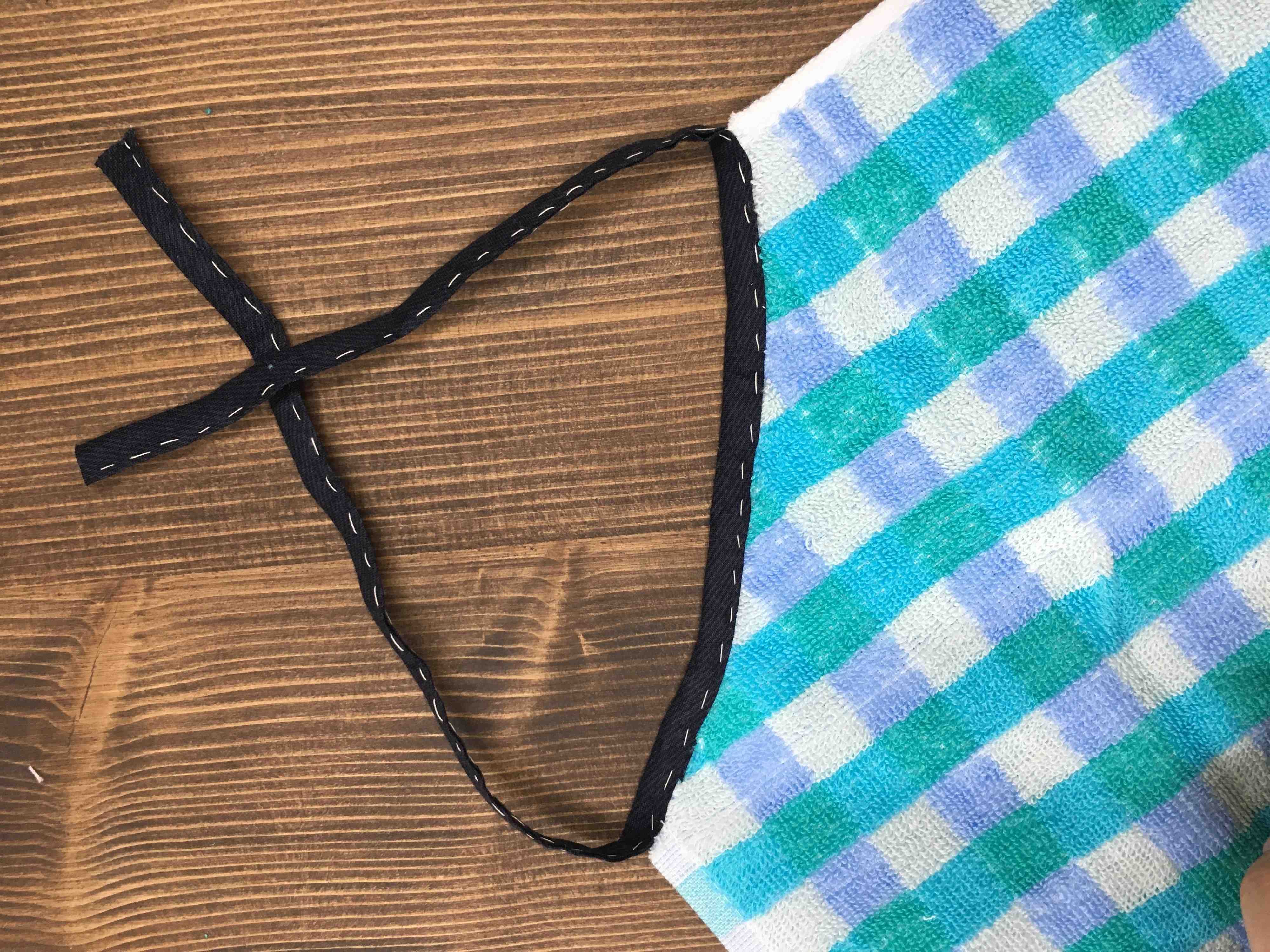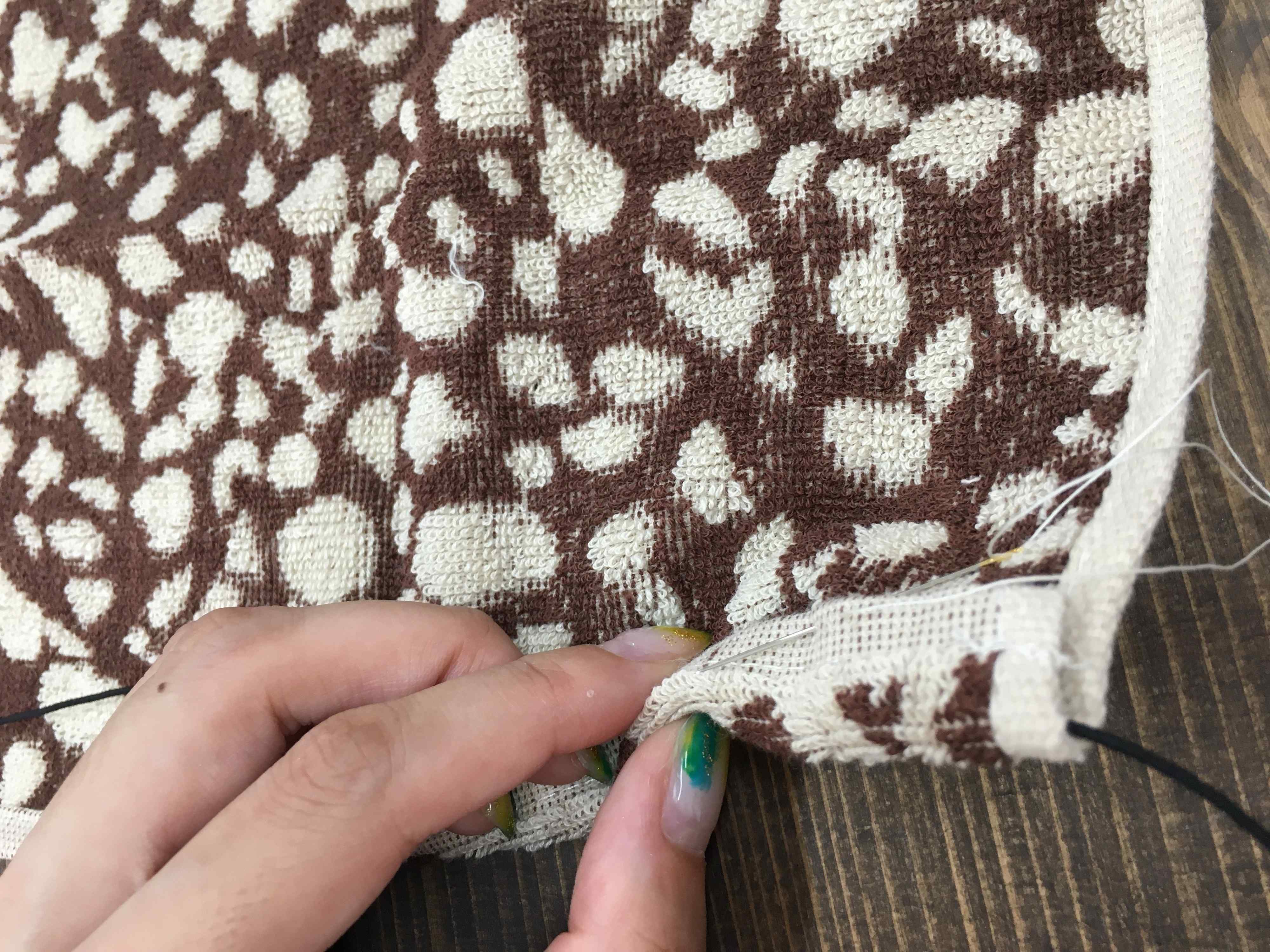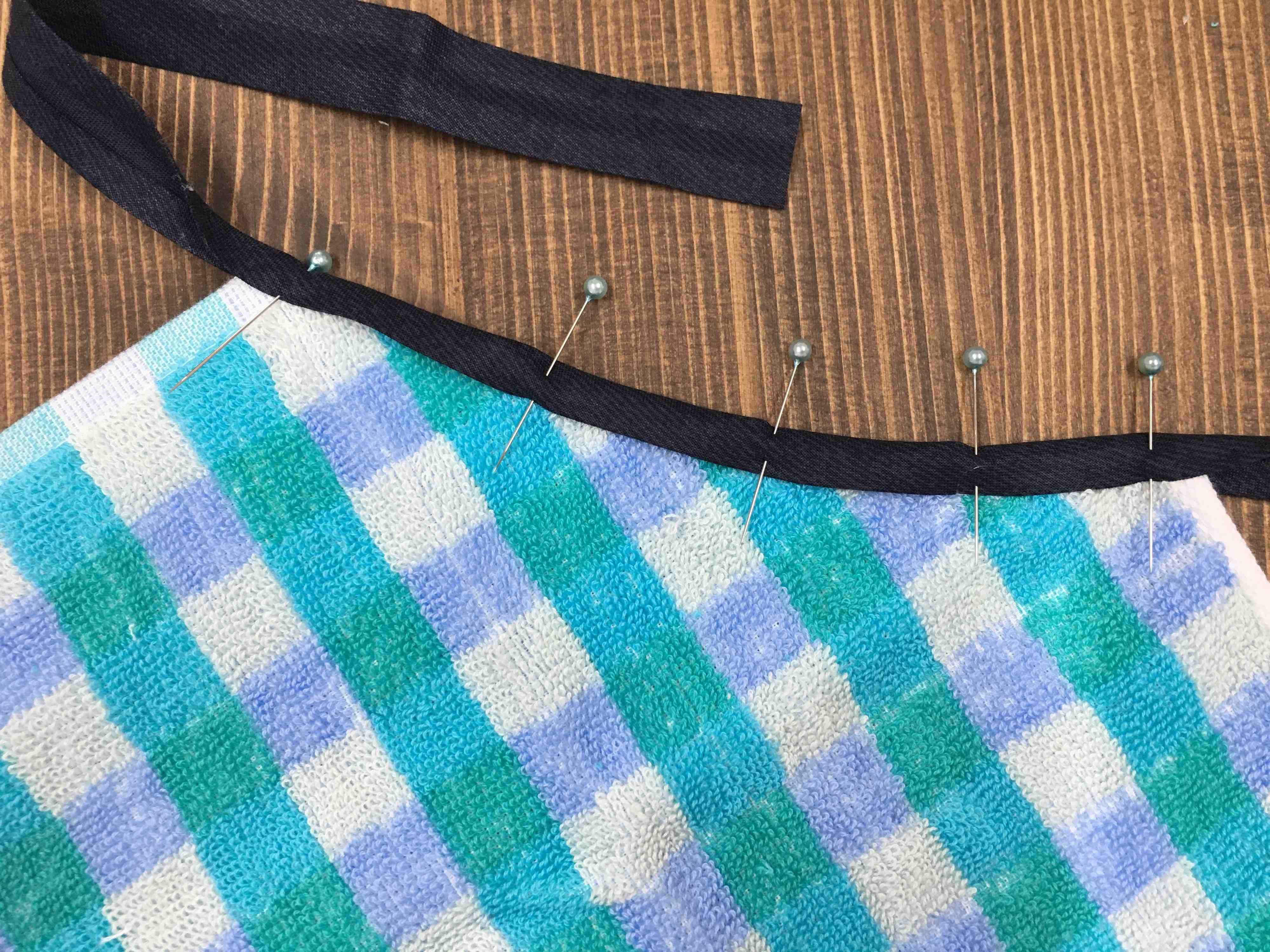 2.バイアステープは50センチの長さにカット。下画像のようにタオルをカットしたところにテープを被せて仮留めましょう。