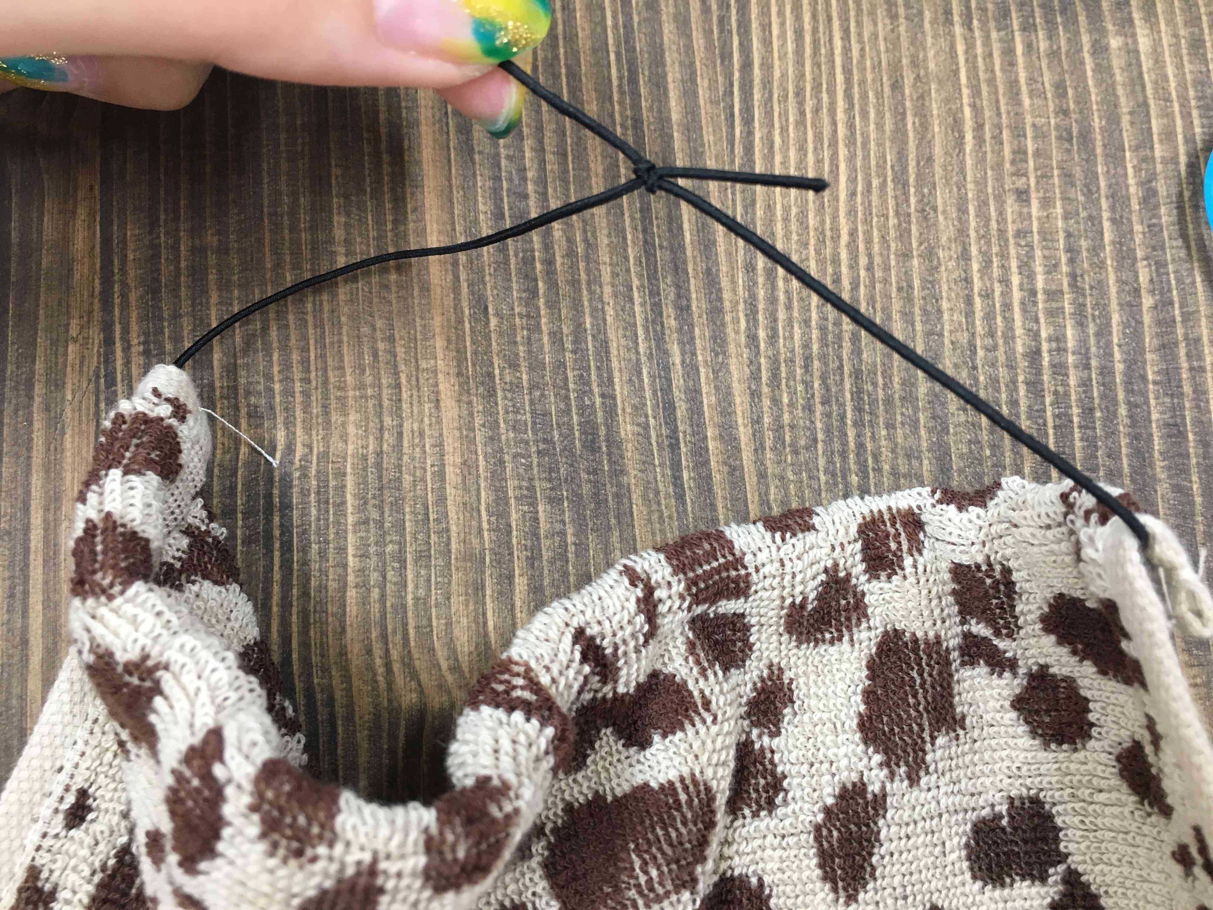3.丸ゴムは45センチの長さでカット!小さく結びます。結び目はタオルの中に入れ込み出来上がり!