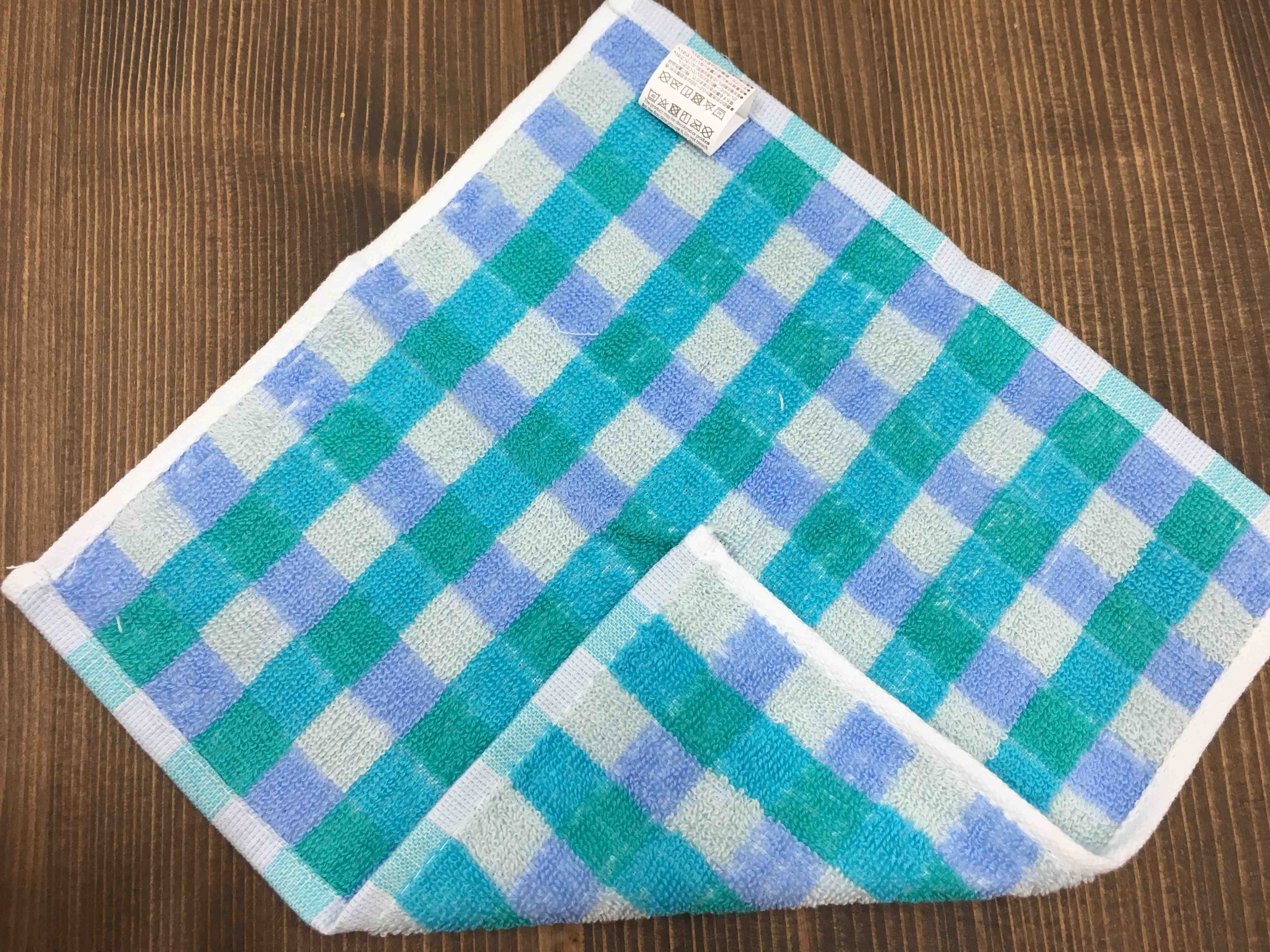 1.ミニタオルを裏返して角を中心まで折り、この部分を切り取ります。少しだけ丸みが出るように中心部分カーブさせながらカットしてもOK。