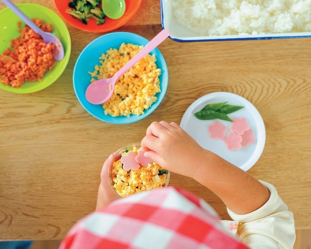 具の用意にもチャレンジ。冷凍ブロッコリーを電子レンジでチンしてほぐしたり、いり卵を作ったりしてみましょう。チーズやほかの具材を入れるなど、子ども自身が彩りを考えながら具を工夫してみても。