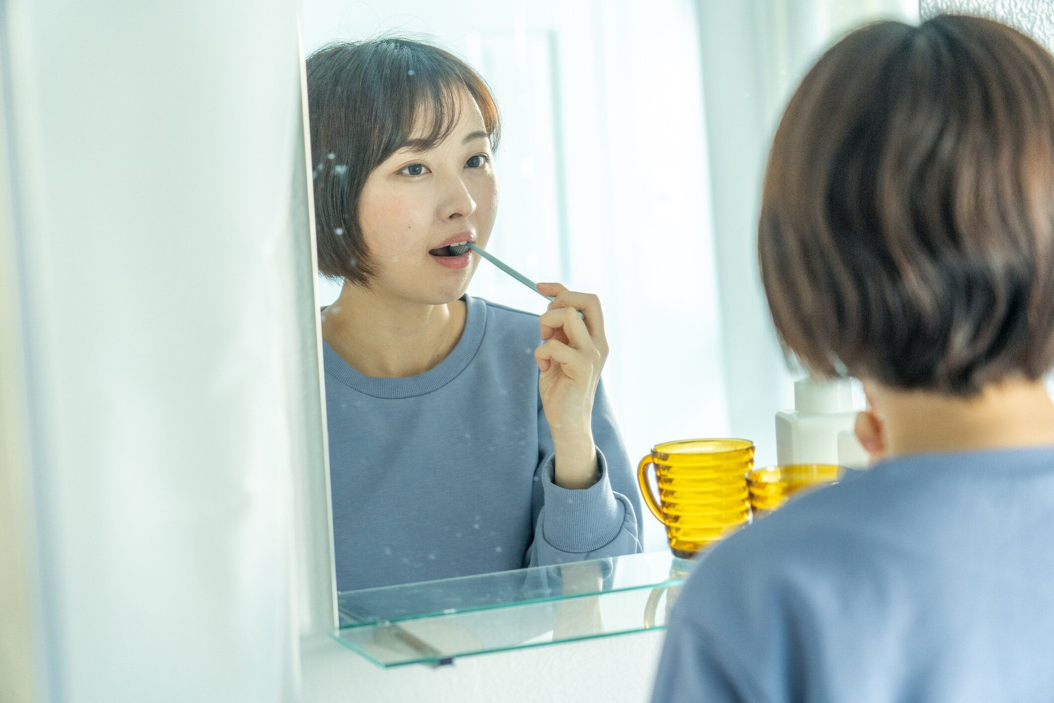 食後に必ず行う歯磨きをしながらやっているのが、洗面台のチェックです。歯を磨きながら、周りを見回すと、鏡についた水滴の跡や洗面ボウルの石けんカスが目につくことも。口をゆすいだら、見つけた汚れを落としておくのを習慣にしています。