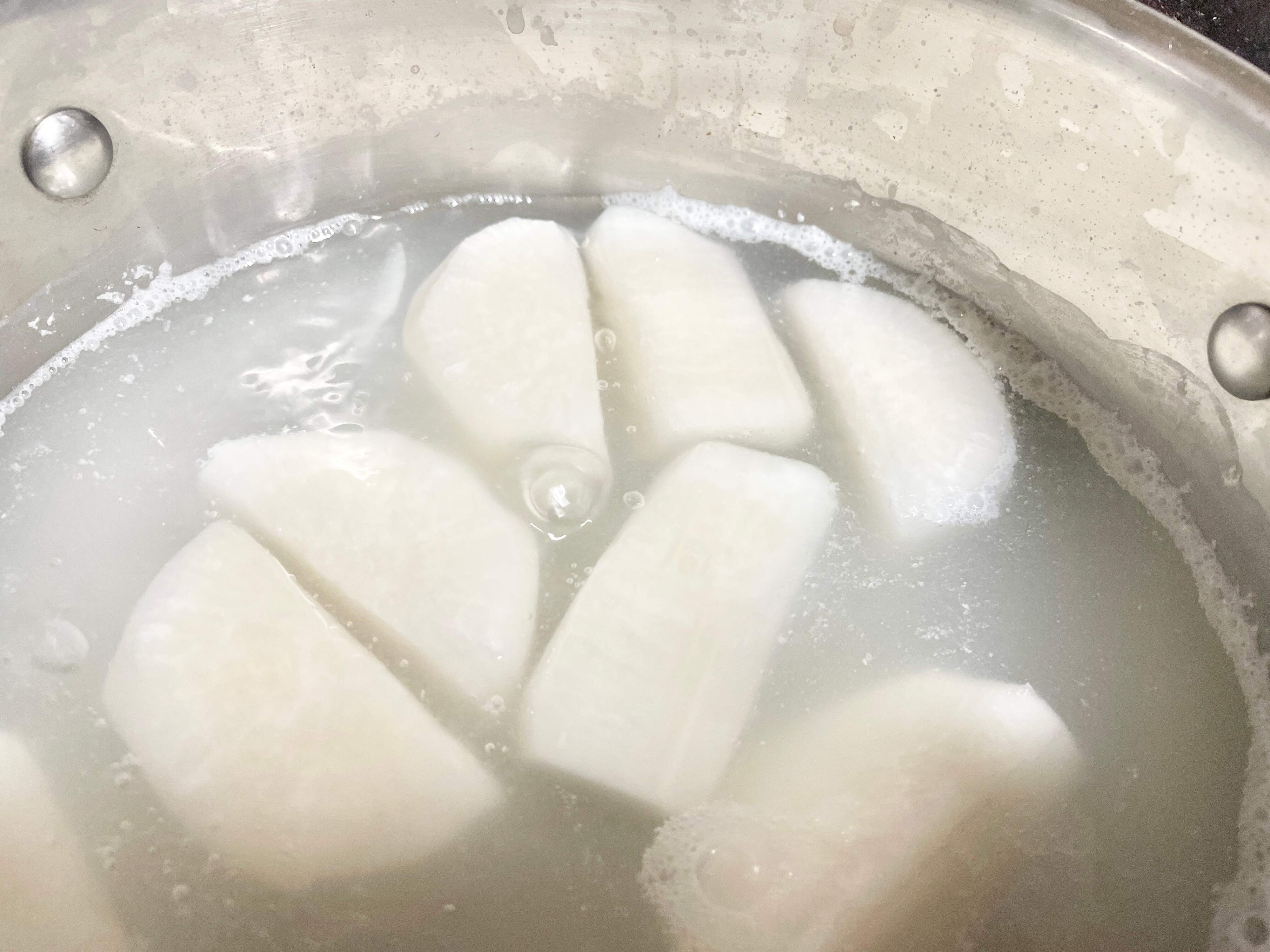 大根の下ゆでにも、米のとぎ汁が使えます。大根のえぐみなどのアクが抜け、とぎ汁に含まれる酵素のはたらきで煮くずれを防ぎ、色も白くキレイになります。また、ごぼうや里芋などの下ゆでにも使えますよ。