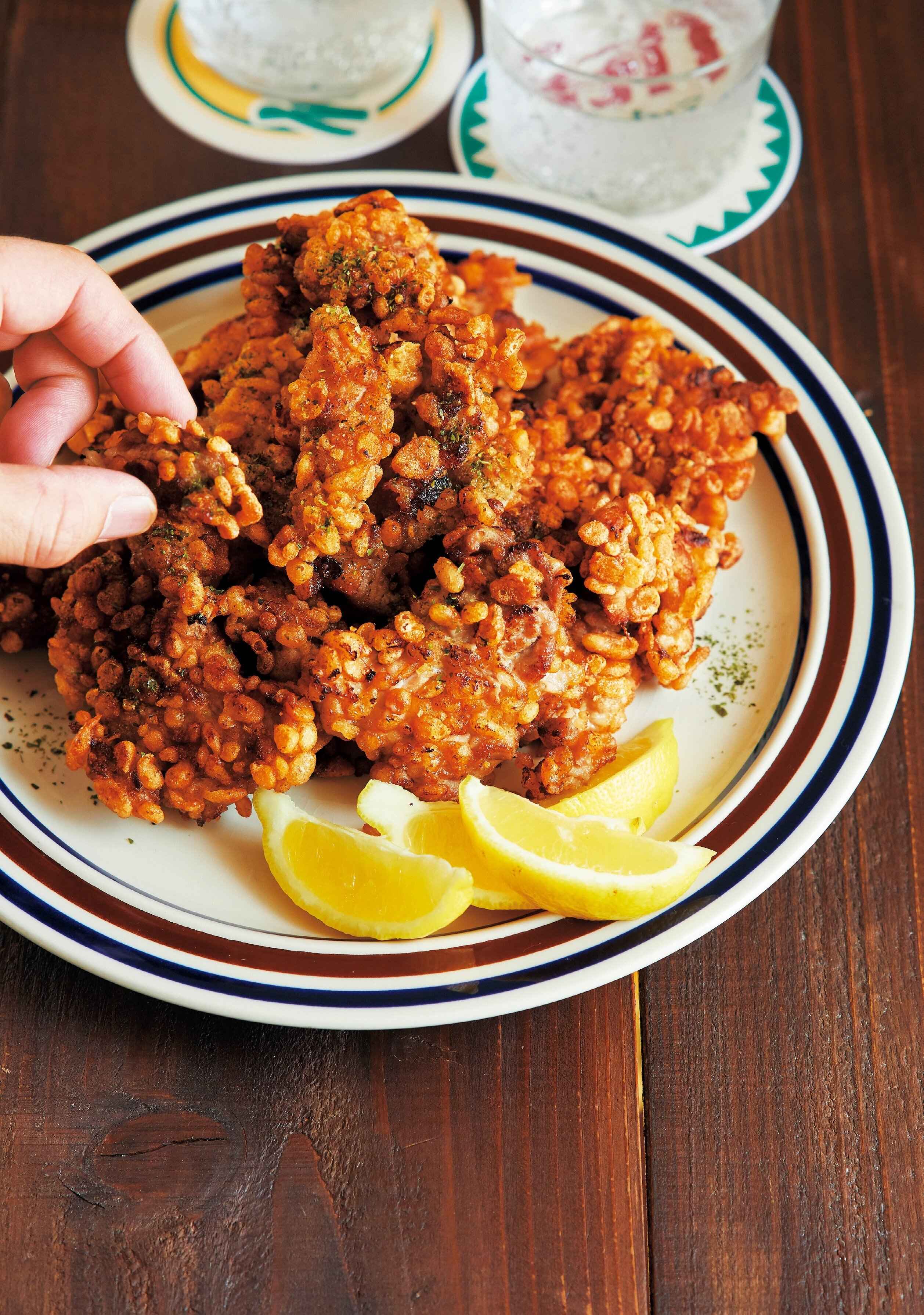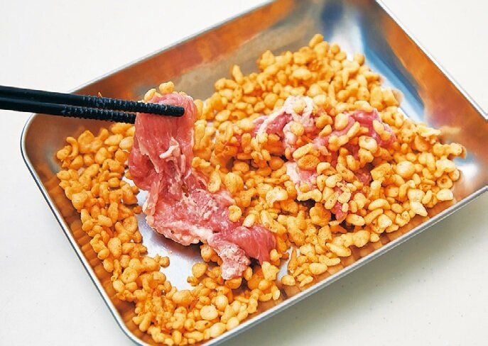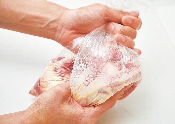 (1)ポリ袋に豚肉と[A]を入れてもみ、片栗粉を加えてまぶす。豚肉を袋から出して食べやすい大きさにまとめ、揚げだまをまぶす。