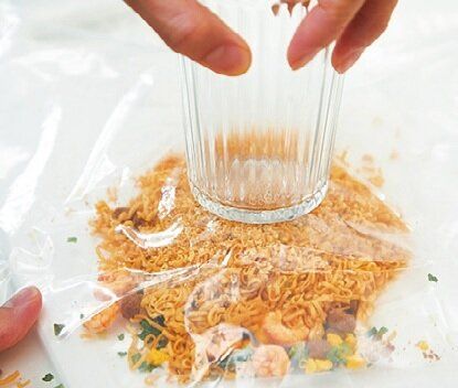 (1)厚手のポリ袋にカップヌードルを入れ、グラスの底などで細かく砕く。