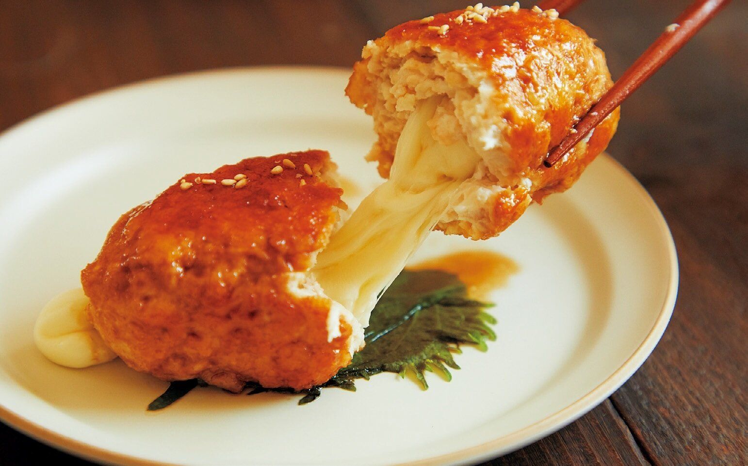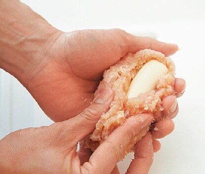 (1)ひき肉と片栗粉をよく混ぜ、4等分してチーズを包む。
