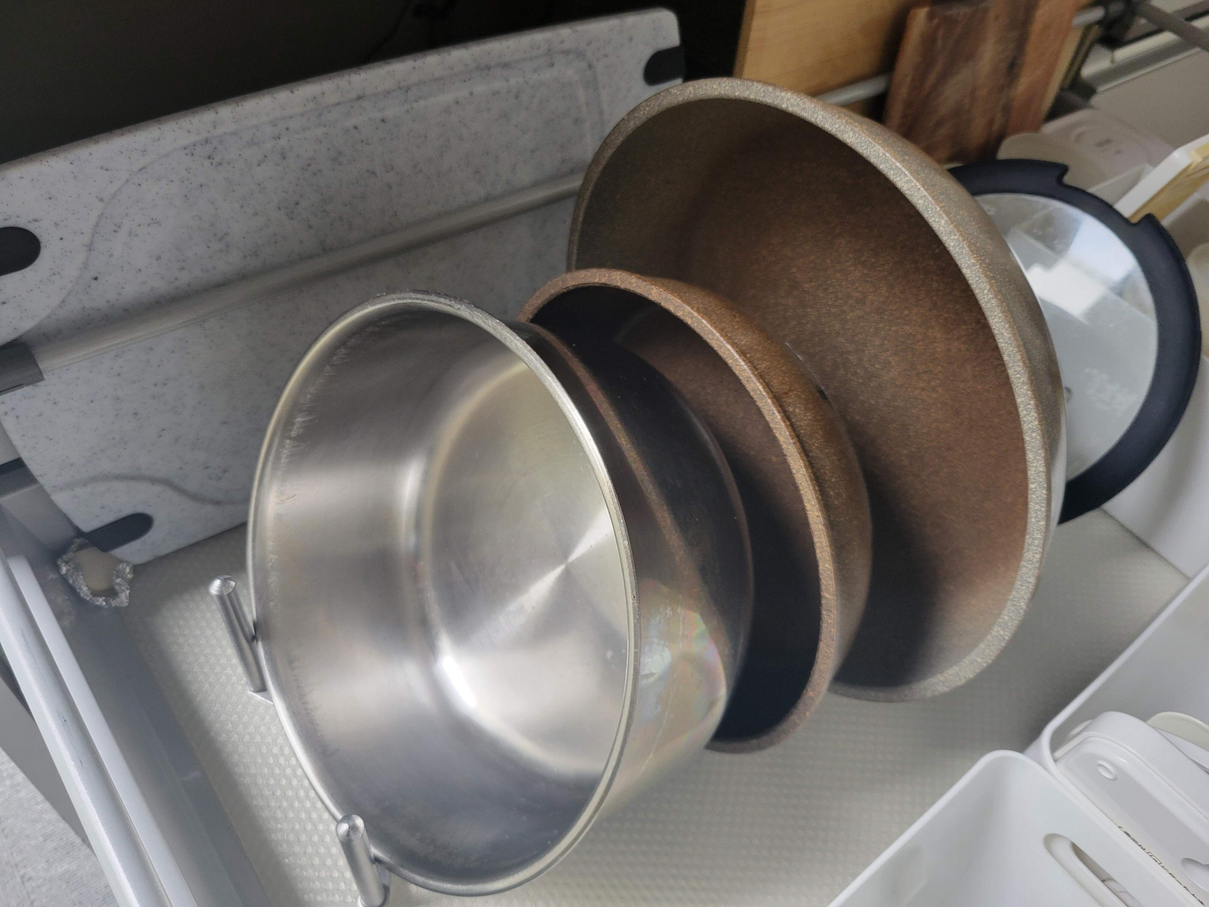 サイズ調整がきくということ、ごちゃごちゃになりがちなフライパンをスッキリ収納させることができるため、このような使い方をされている方もいます。
