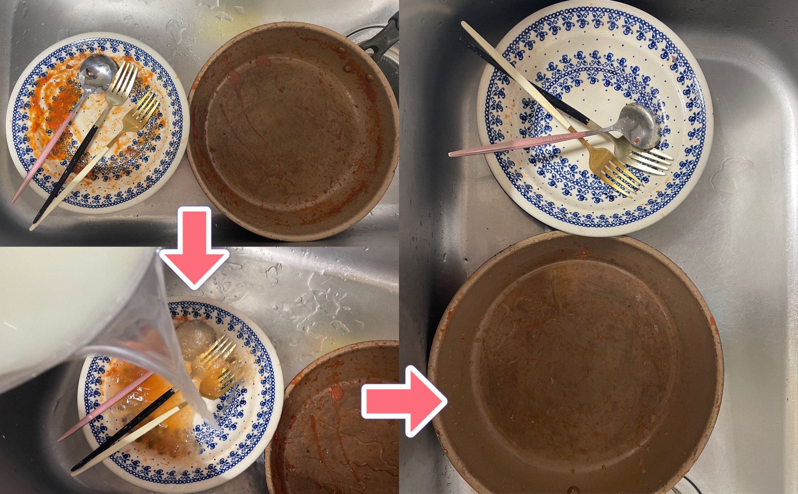使い終わった食器やフライパンをシンクに置き、上からゆで汁をまわしかけるだけでもある程度の汚れが落とせます。その後、洗剤を使って洗ったり食洗機に入れたりするのがいいですよ。