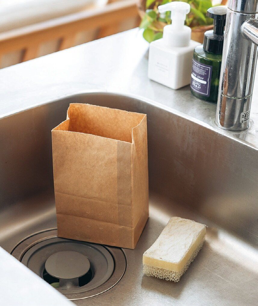 今イチオシという水切り袋。「最初は紙!?と思ったけど、丈夫で水を切るのも上手。生活感が出ないし、ないと発狂します(笑)。スポンジは泡立ちも水切れも抜群で、清潔感のある白が好き」。