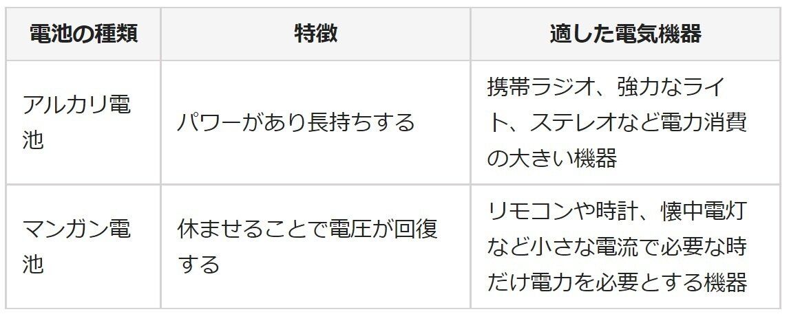使い捨ての電池は大きく分けて「アルカリ乾電池」と「マンガン乾電池」の2種類です。