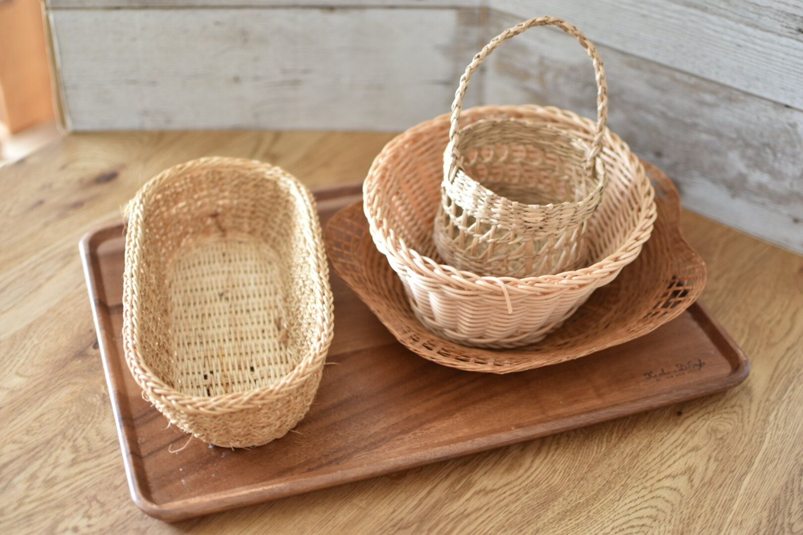 果物やちょっとしたお菓子の収納に、いろいろなサイズのカゴを用意しています。