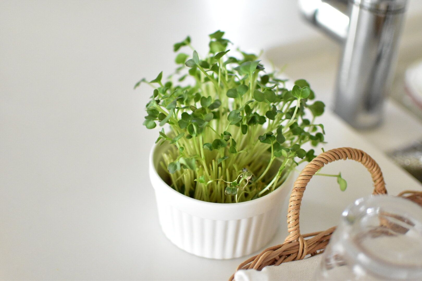ココットはかいわれ大根を入れるのにぴったりサイズ。水道の近くに置いておくとこまめに水を取り替えることができます。